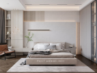 简洁的背景墙板搭配原木色,让空间整体更加温馨,贯穿式床头柜,储物壁龛.....