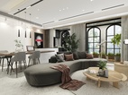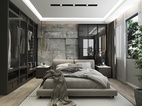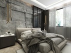 整个屋子的布局与装饰,完全不用直线,用水泥,主要构建一个简单的空间,没有过多的结构语言,在软装材料上搭配跳色,大面积的浅灰色以及蓝色搭配轻松自然的简约工业卧室。同时,选用灰色皮艺窗帘和黑色窗框作为反差,打造出极具年轻个性的轻工业空间。