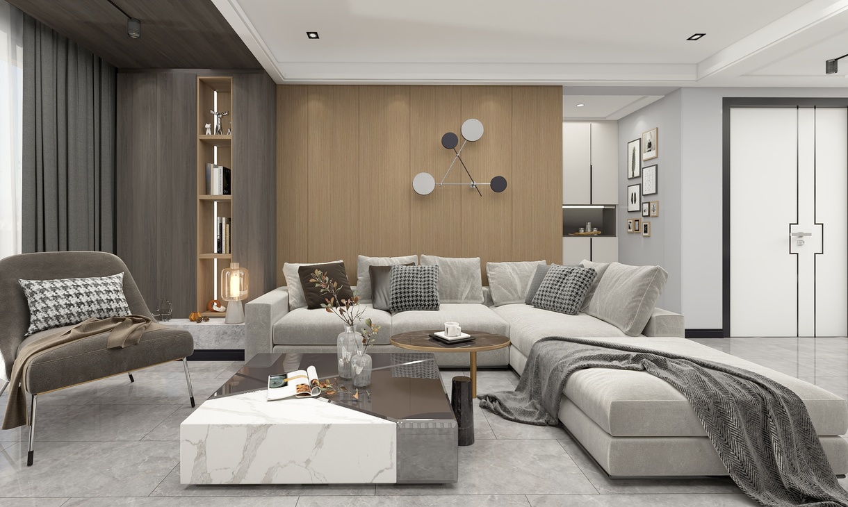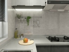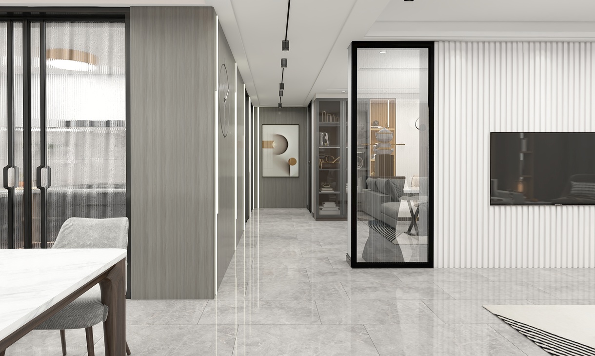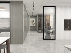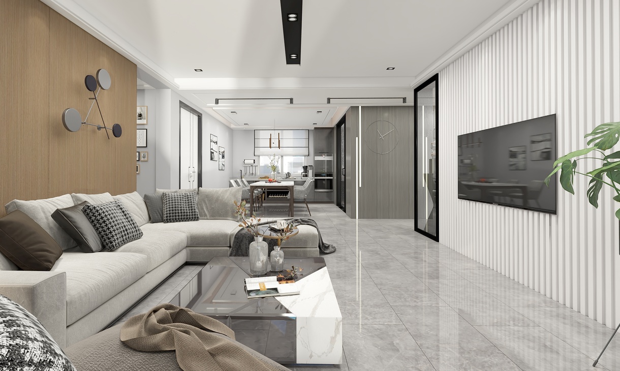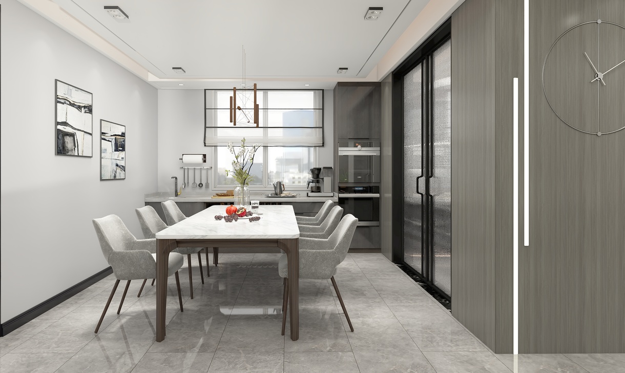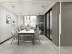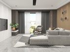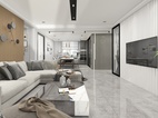 简约的灰色地砖主导了餐客厅的主色调,搭配木色定制柜