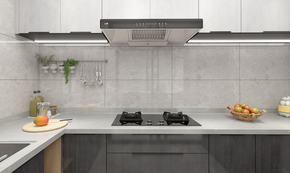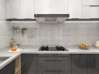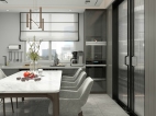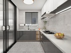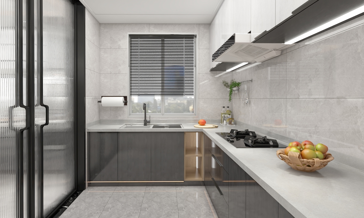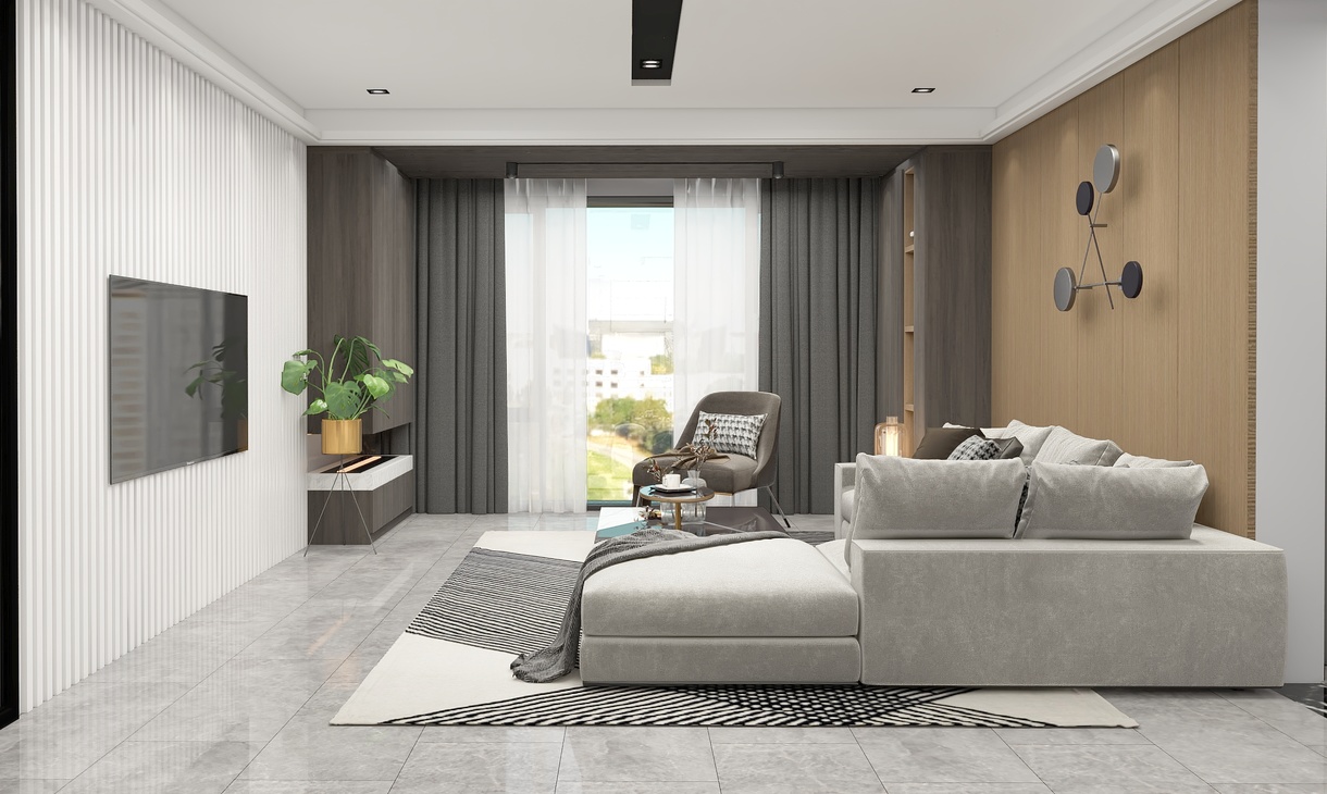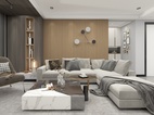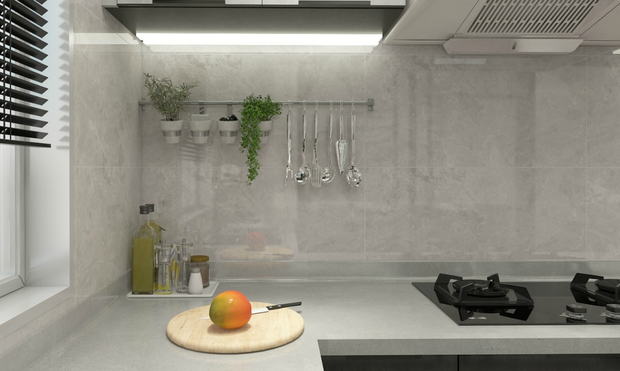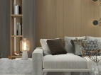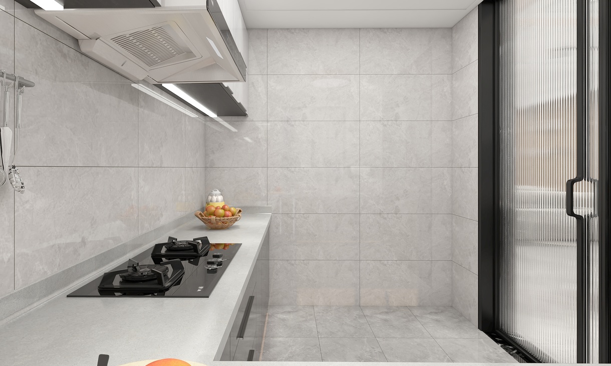 简约的灰色地砖主导了餐客厅的主色调,搭配木色定制柜