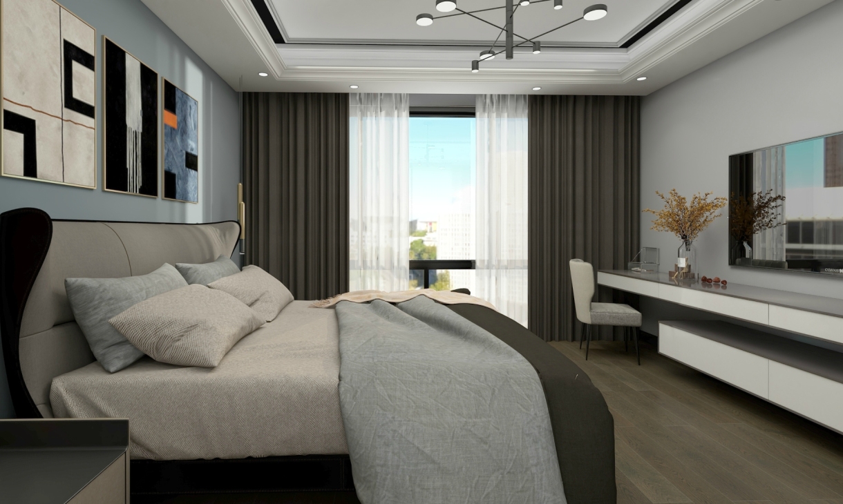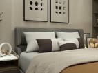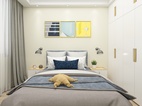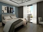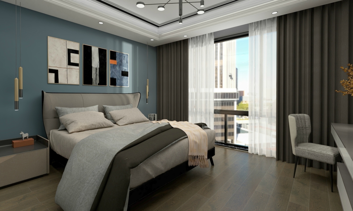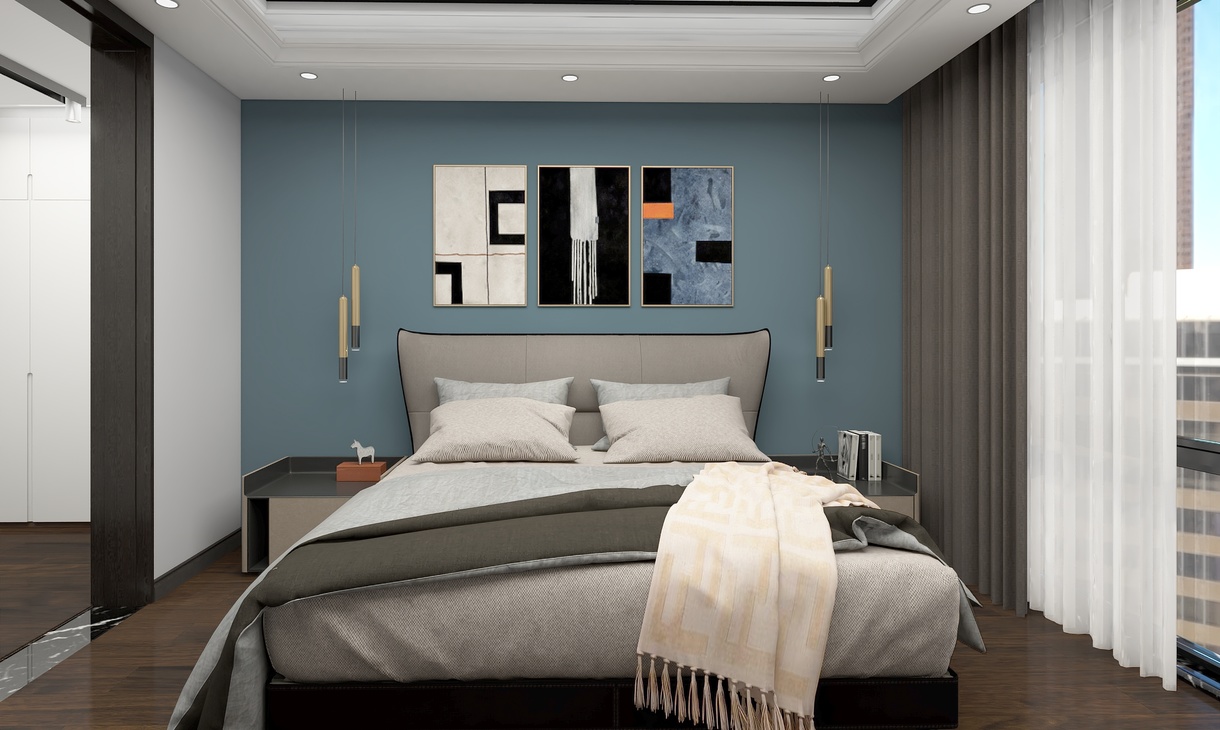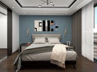 蓝色能舒缓心情,主卧床头背景墙采用蓝灰色乳胶漆,使房间变得更静谧。