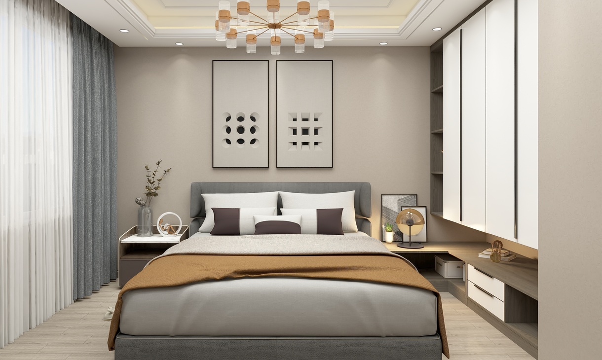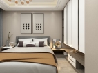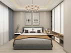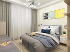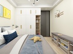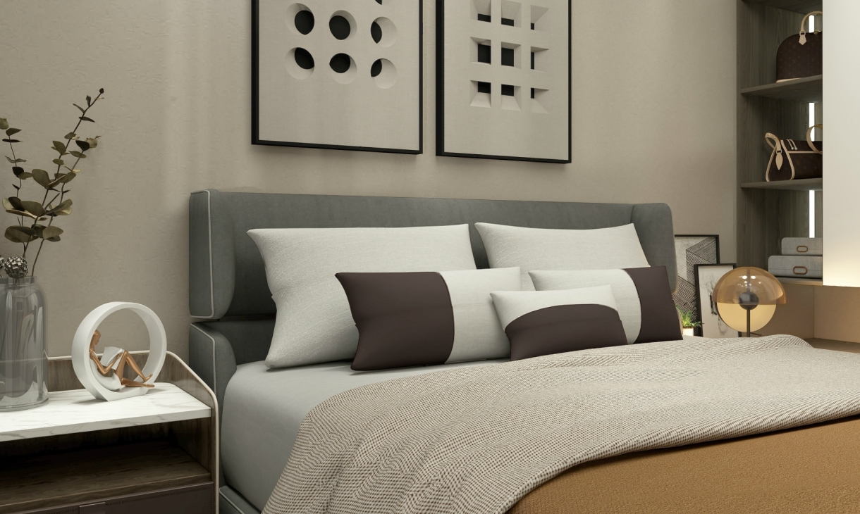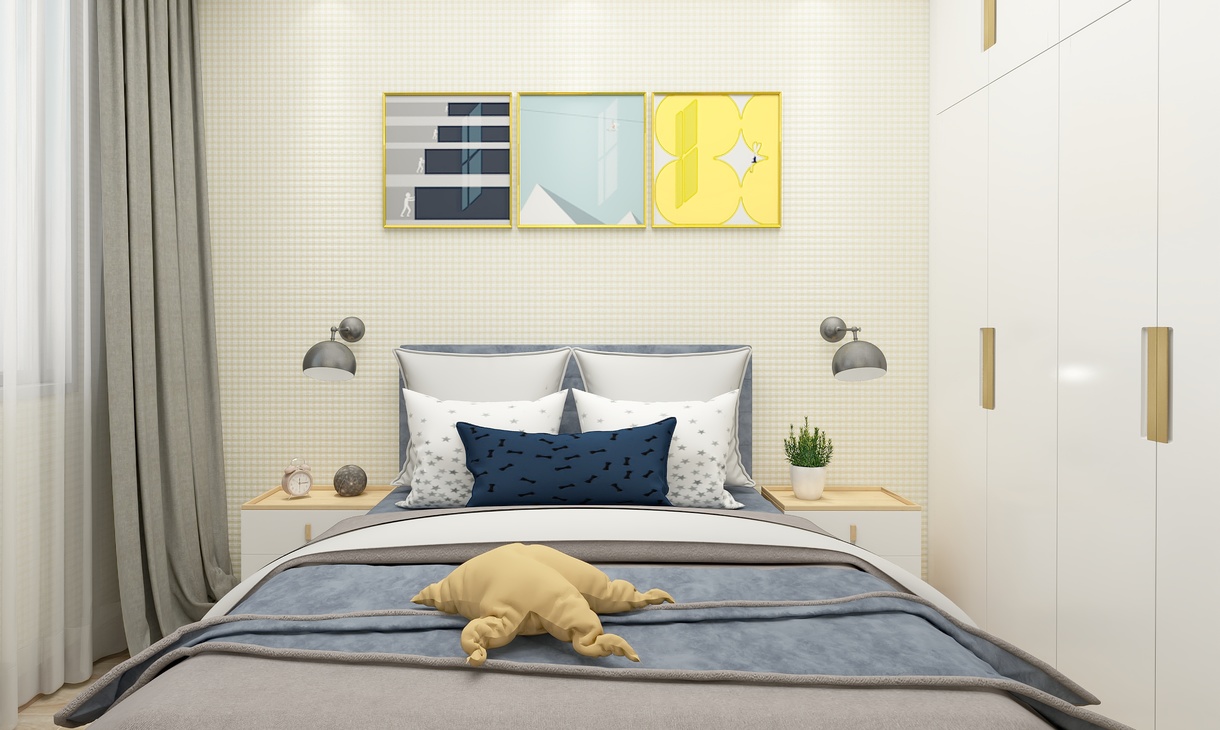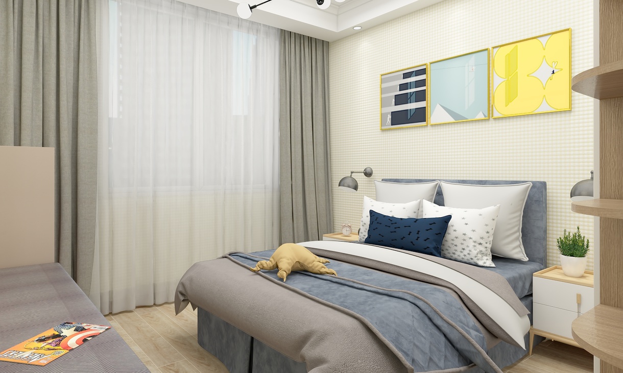 蓝色能舒缓心情,主卧床头背景墙采用蓝灰色乳胶漆,使房间变得更静谧。