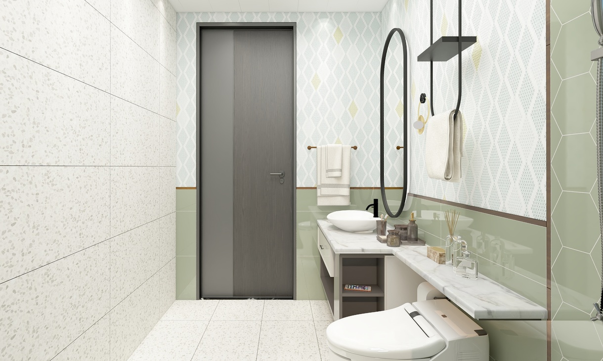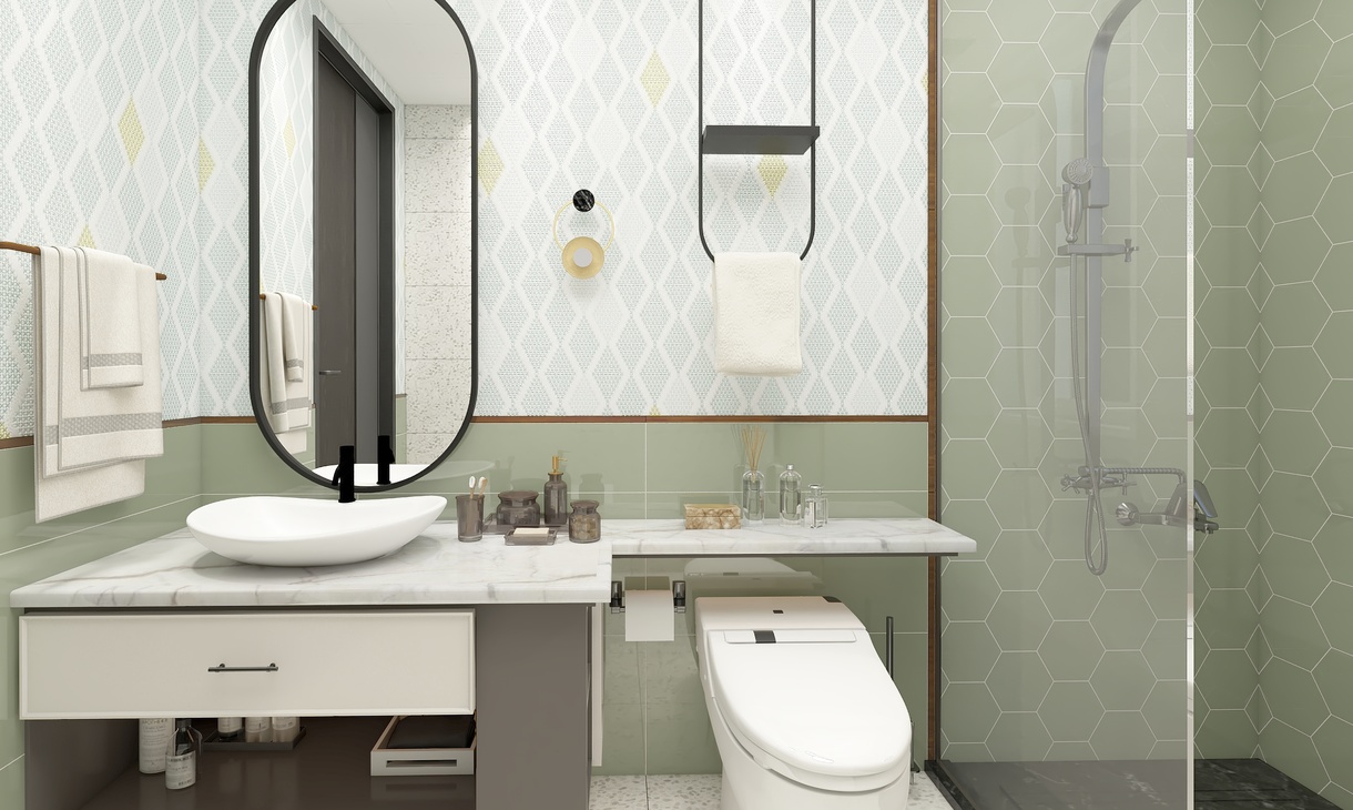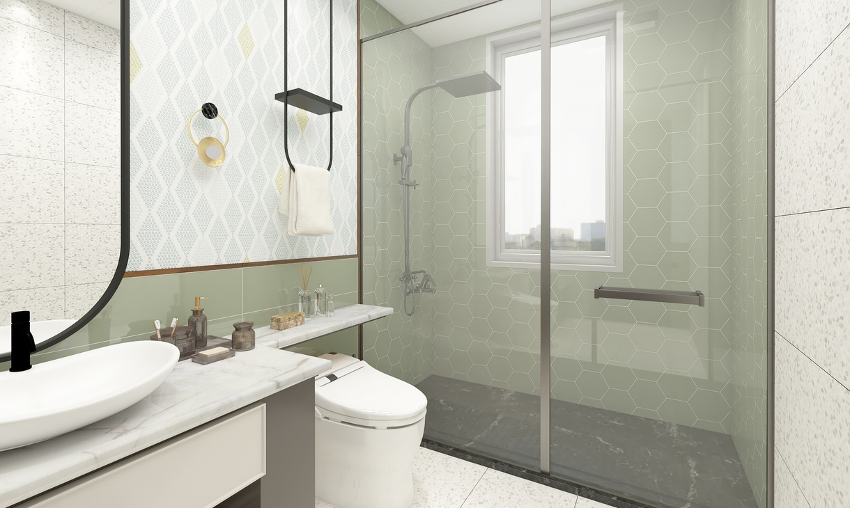 绿色水刀造型背景墙砖,搭配大理石白地砖,整体空间又复古又清新