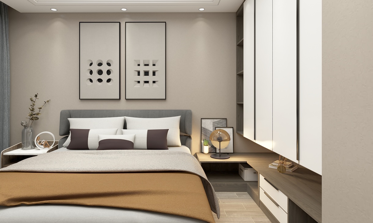 客房的衣柜在整体空间布局中,嵌入墙面,中间镂空设计,延展出一个床头柜