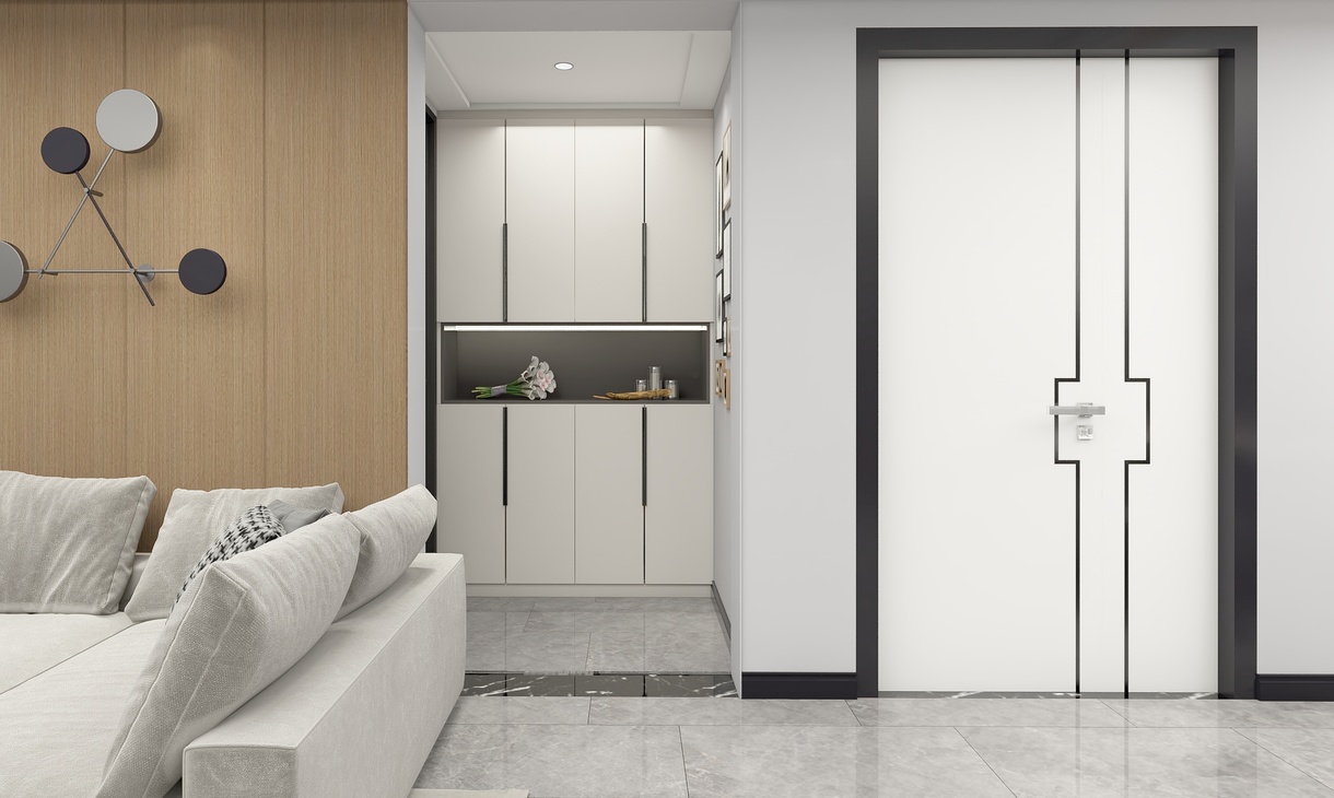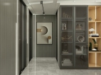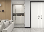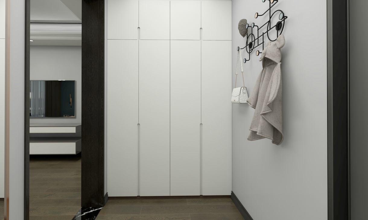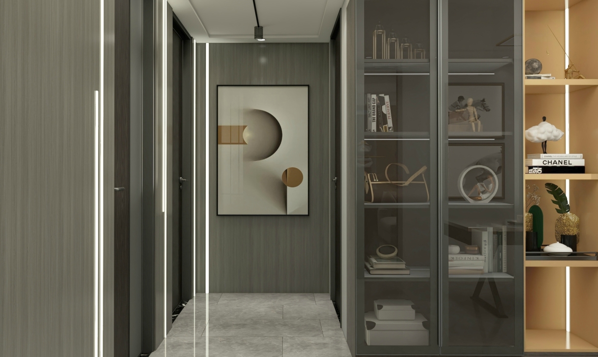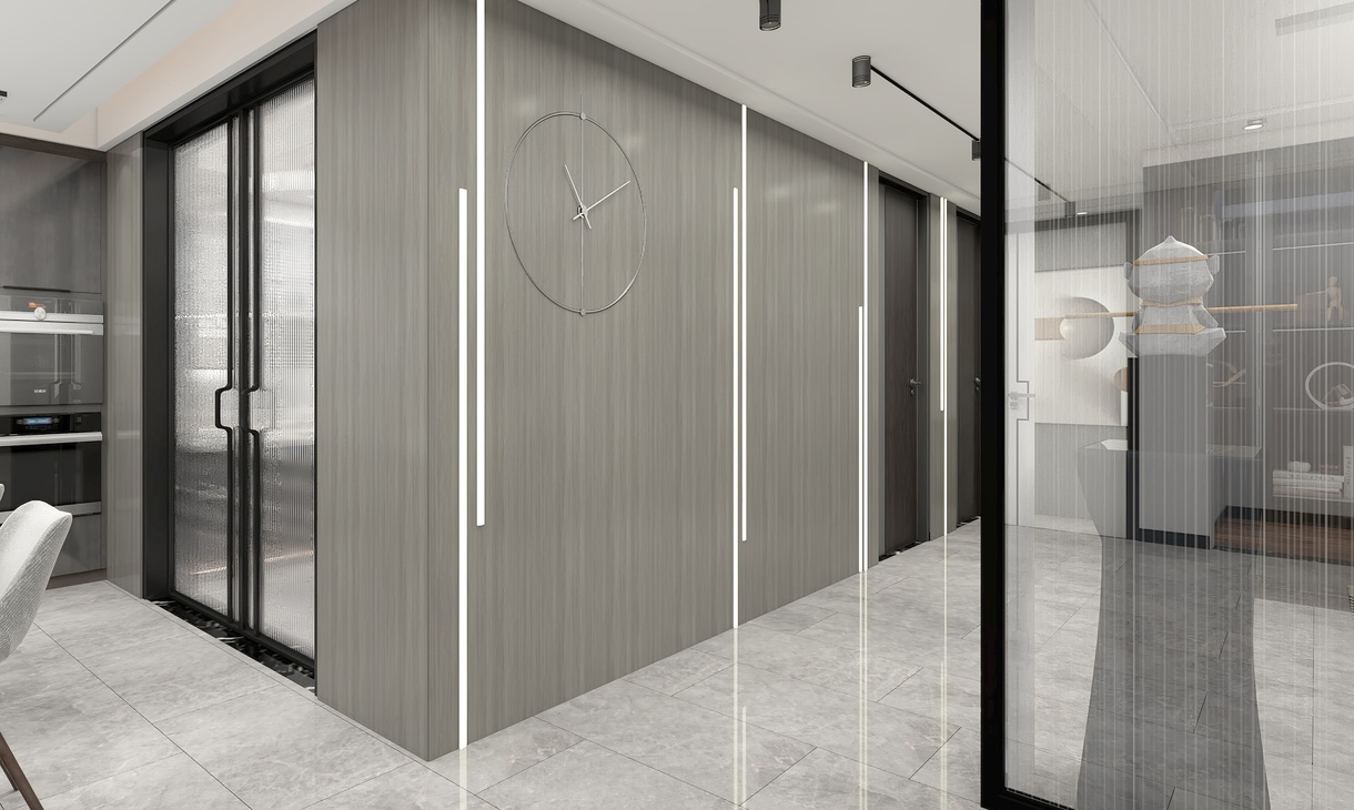 过道墙面灰色木饰面,在进门处做储物鞋柜
