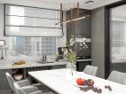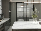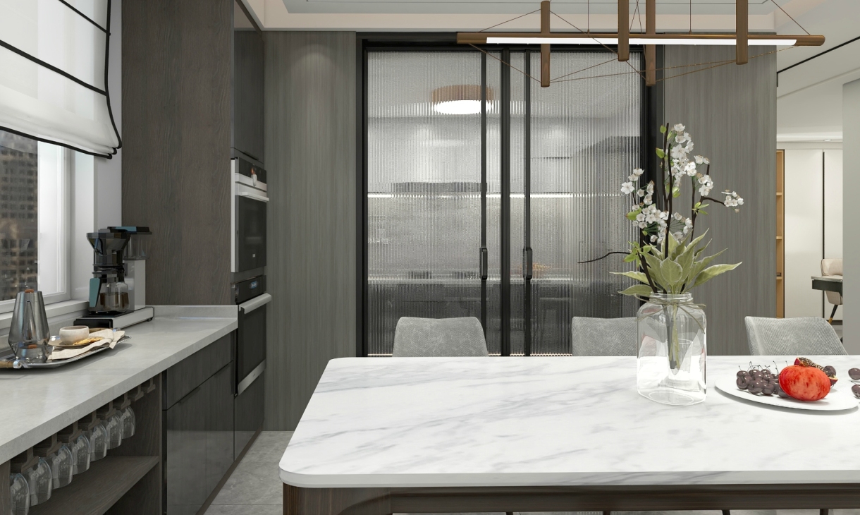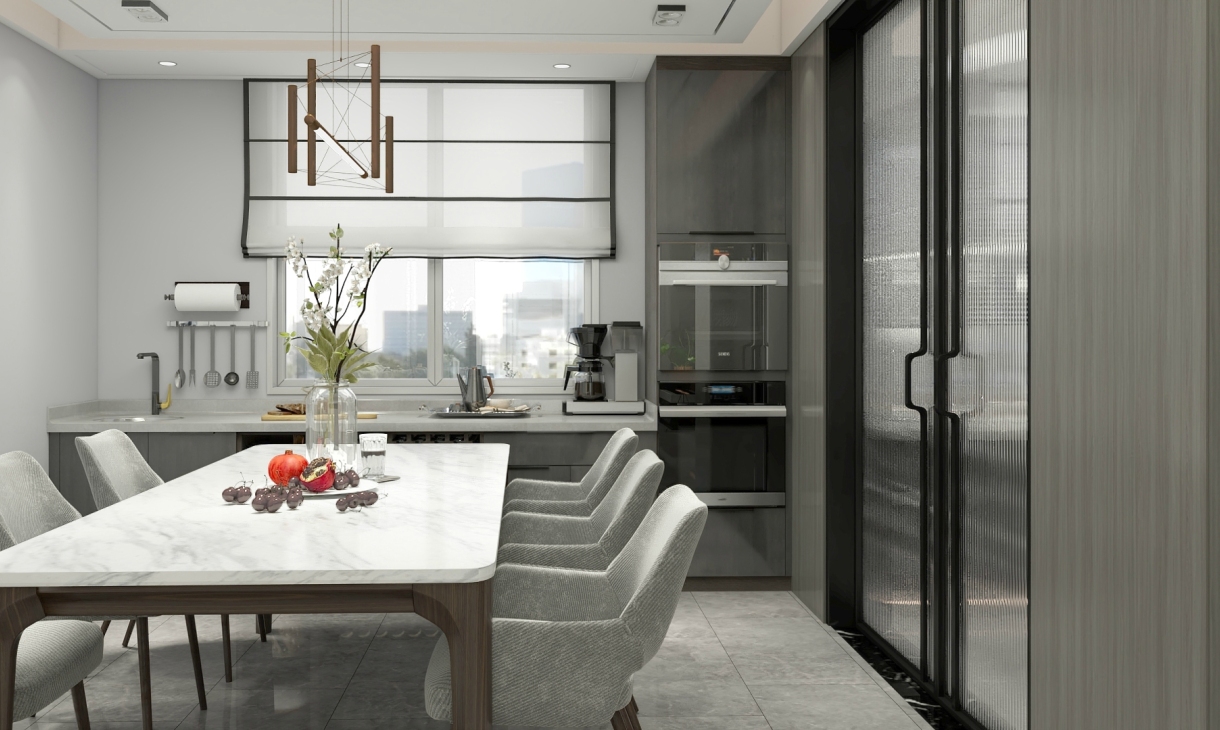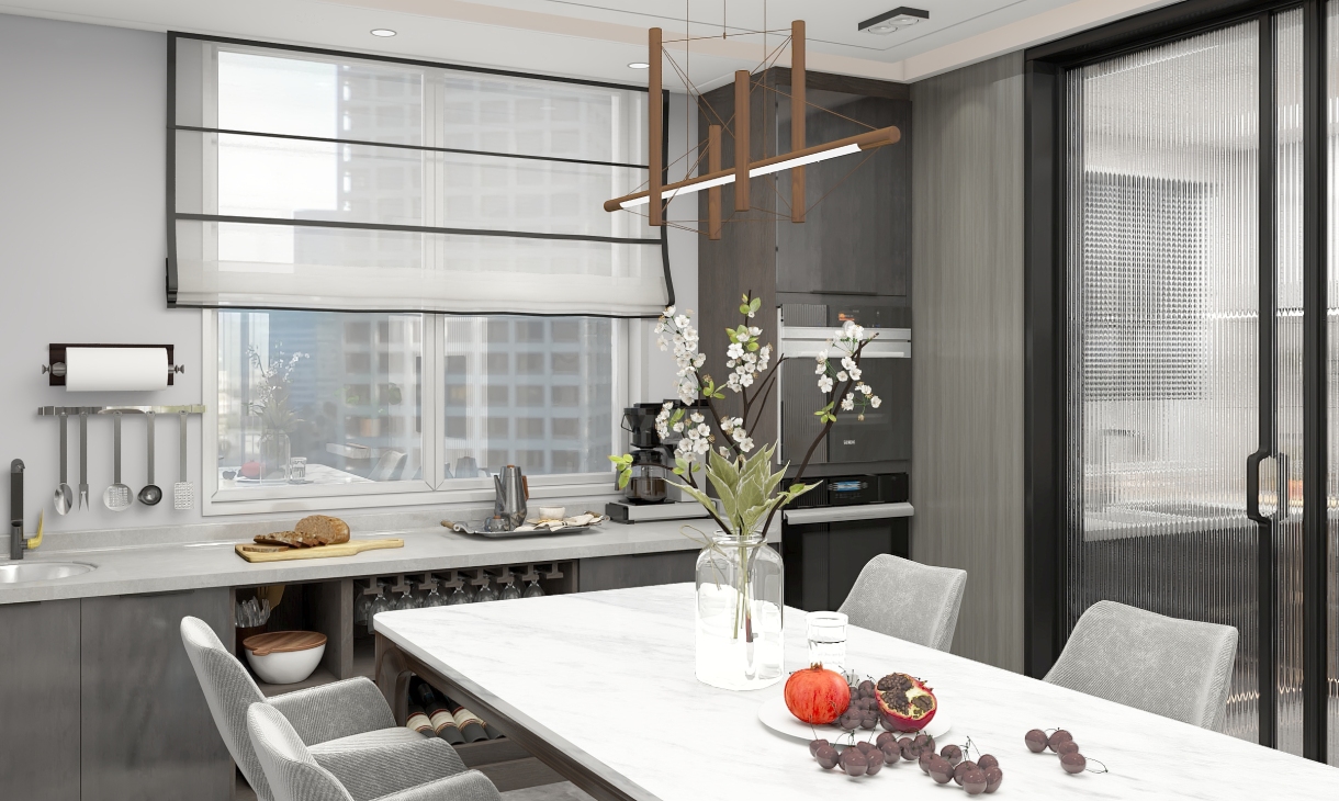 餐厅靠窗做整组定制橱柜,扩大了厨房的使用,也满足餐边柜功能