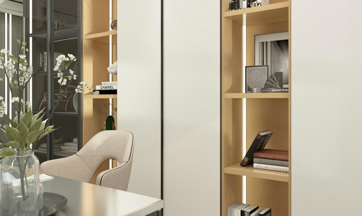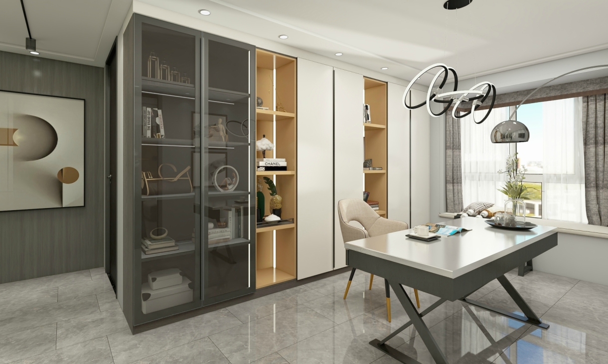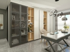 书房在兼具办公的同时,也放置了跑步机健身设备,整体定制书柜增加了日常储物需求