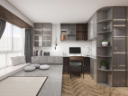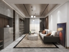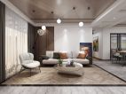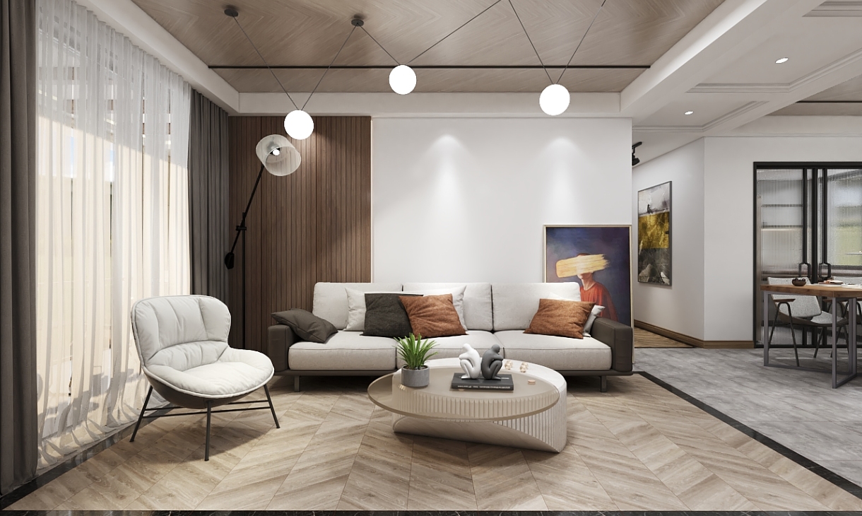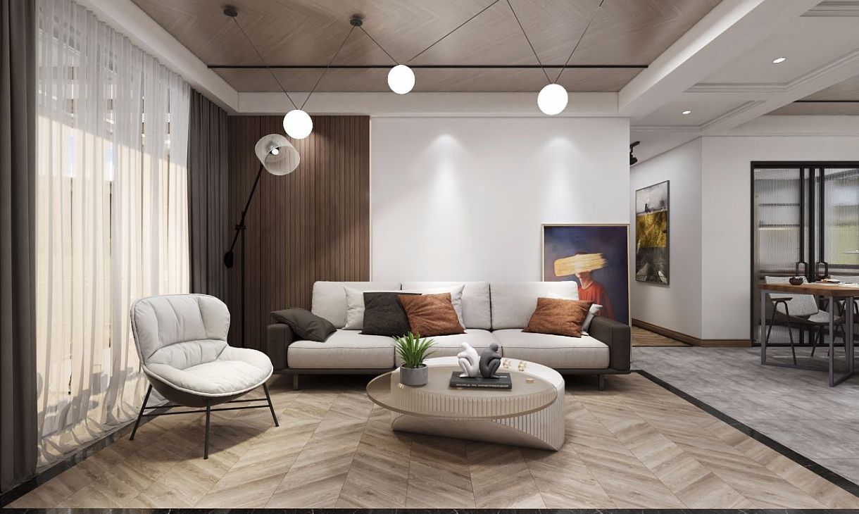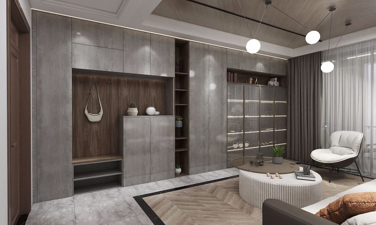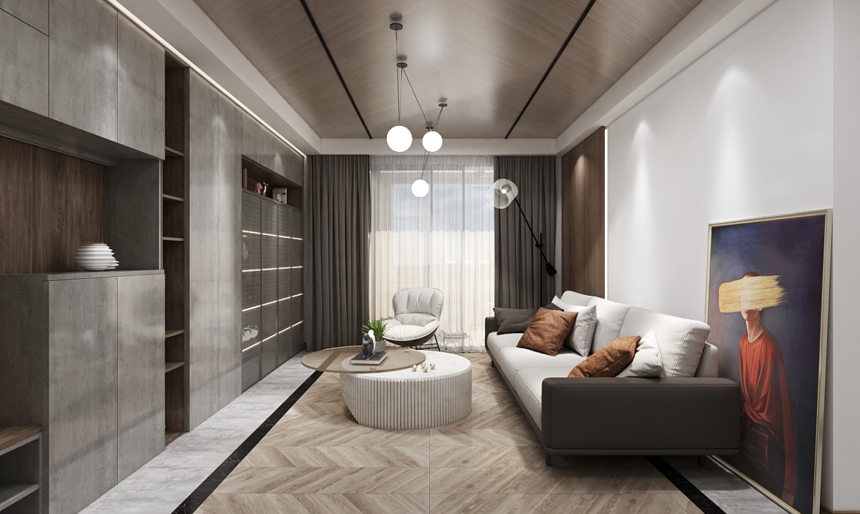 客厅摈弃了电视的设计,采用整体统一的收纳墙代替电视,回归更多的时间给家人交流。收纳空间也是进一步提升。地面采用水泥灰搭配木纹。沙发背景墙同样采用木饰面板去呼应地面。