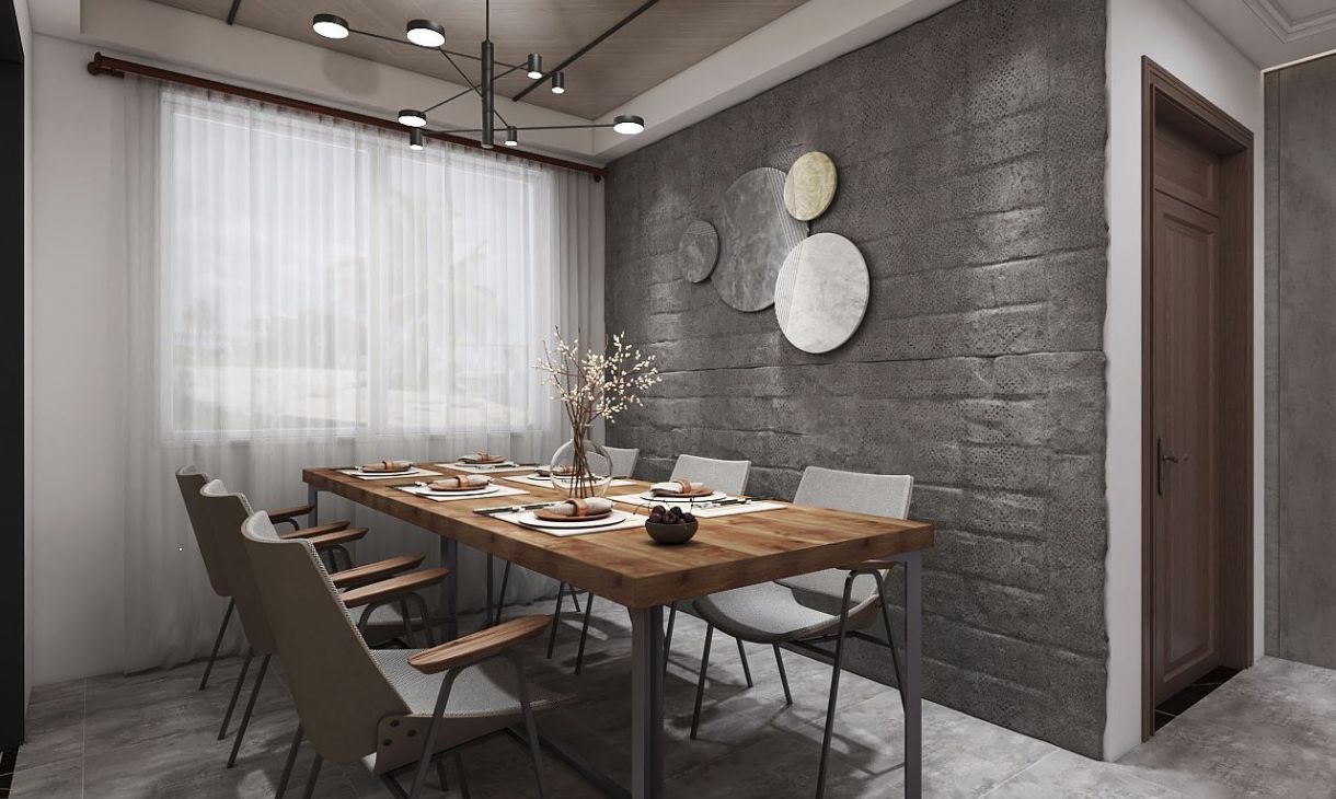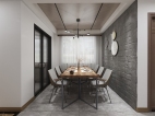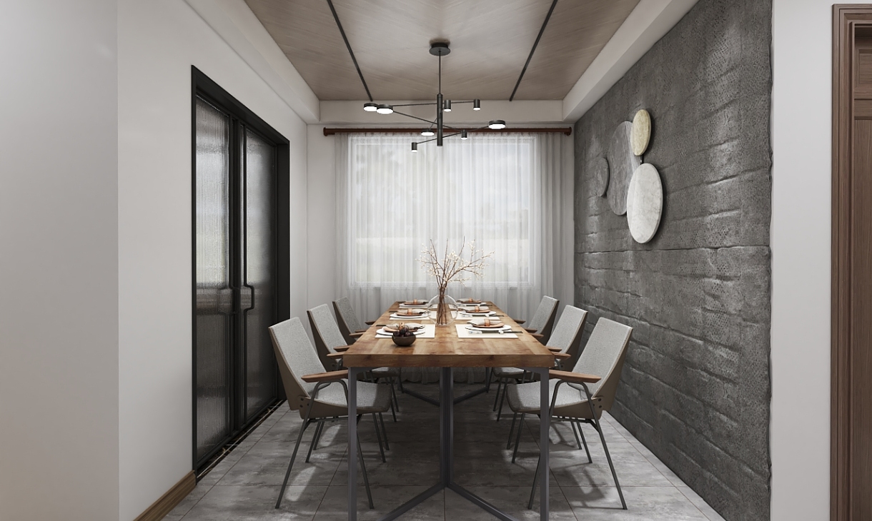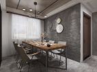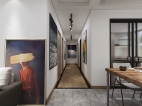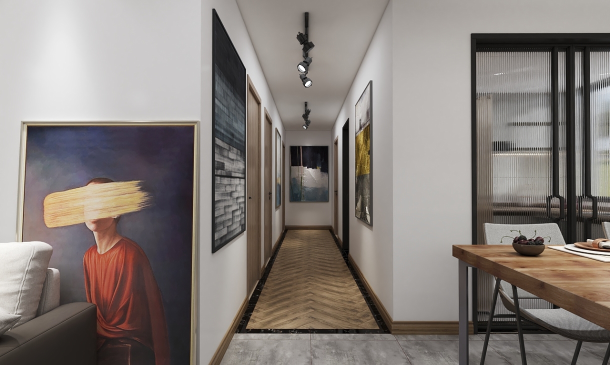 餐厅木质感餐桌搭配金属餐桌椅,餐厅背景采用了大面积文化石设计,整体空间工业气息浓重。过道更是别出心裁,设计成为一个个人画廊。平时个人收藏都可以展示出来。