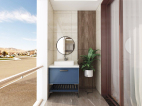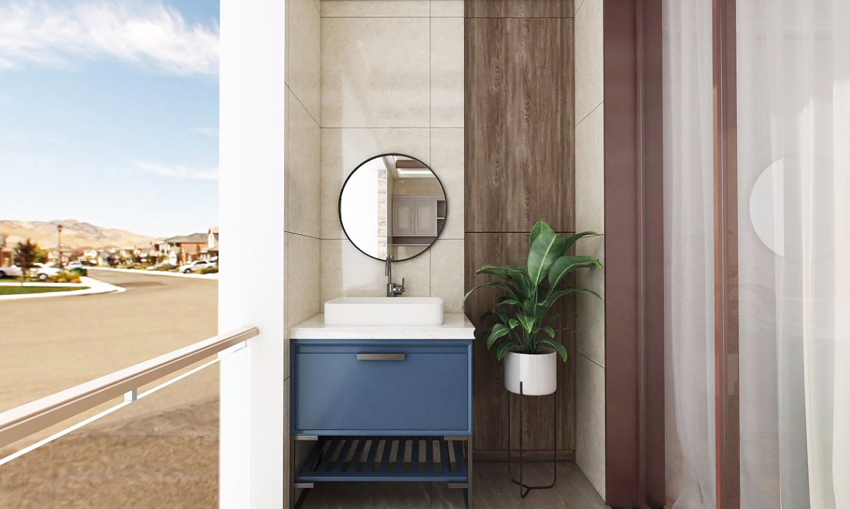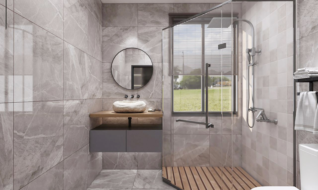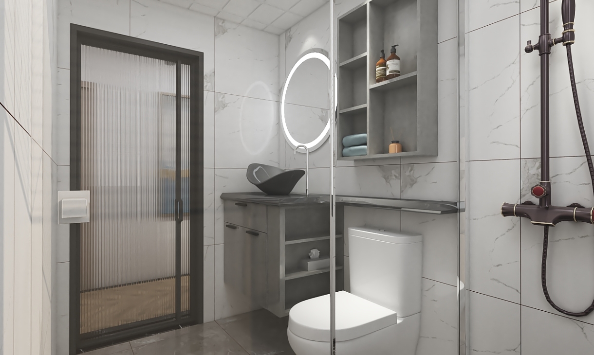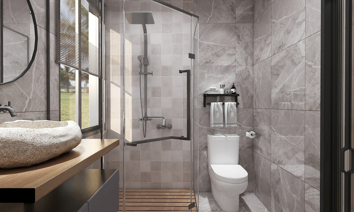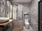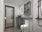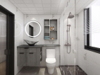 主卫设计了干湿分离区,淋浴房采用防腐木,木质搭配整体的水泥灰,柔和了冰冷的卫生间。