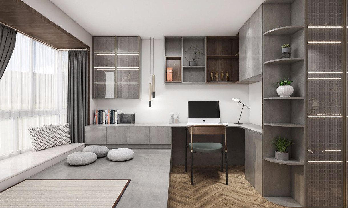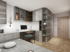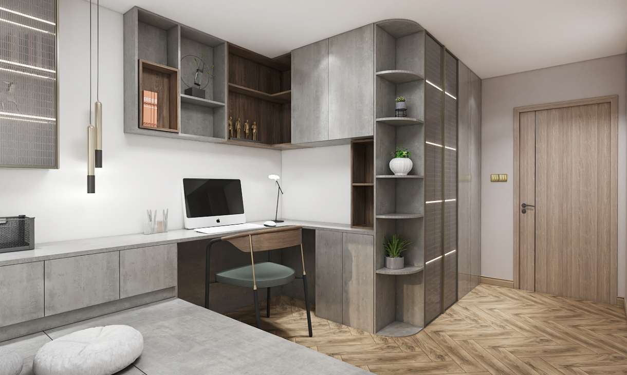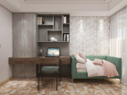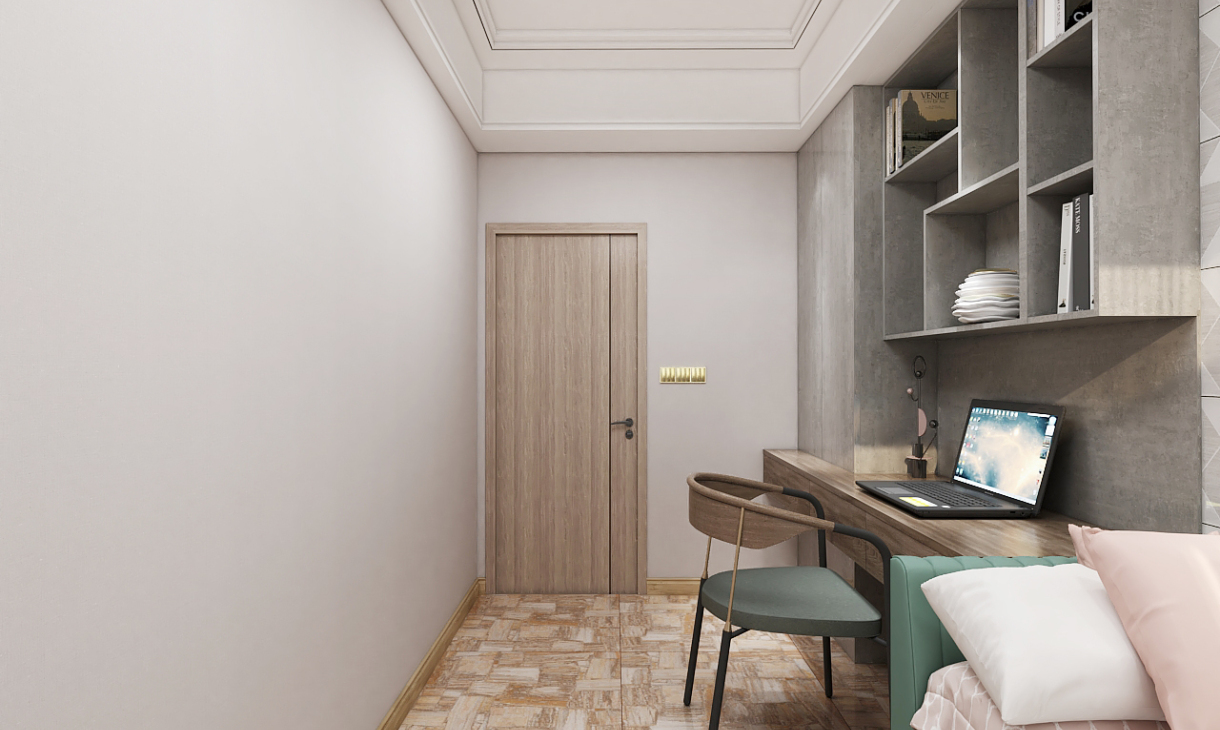 进门大面积的衣柜+书柜+榻榻米的整体结合,无论是空间收纳还是整体搭配,都是得到进一步升华。活动空间一样得到保障,转角处设计了圆弧柜,安全得到了保障。