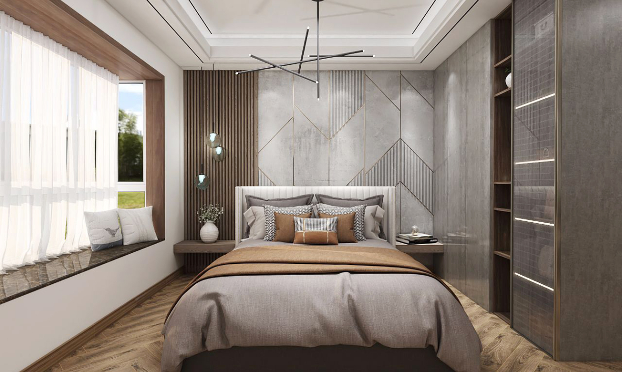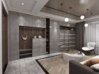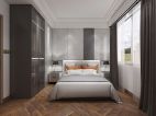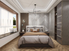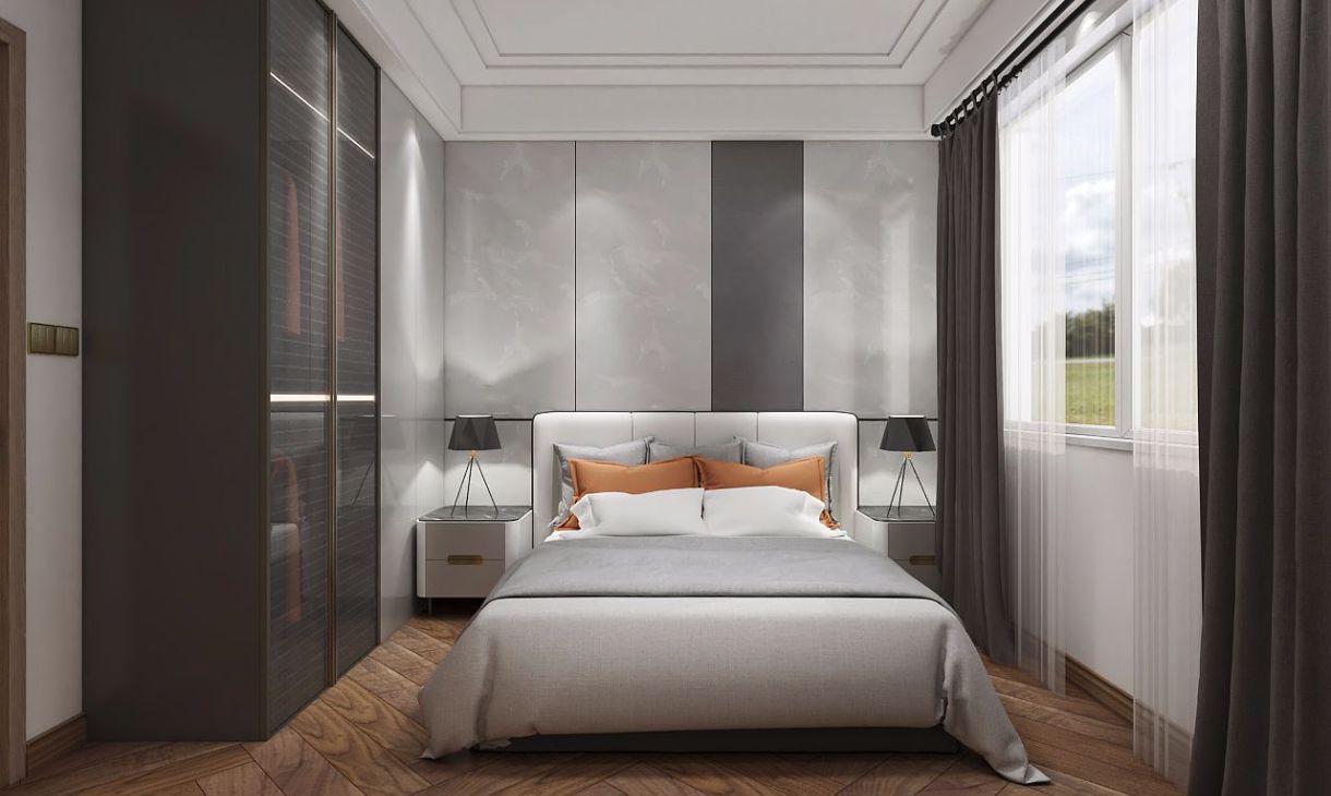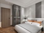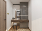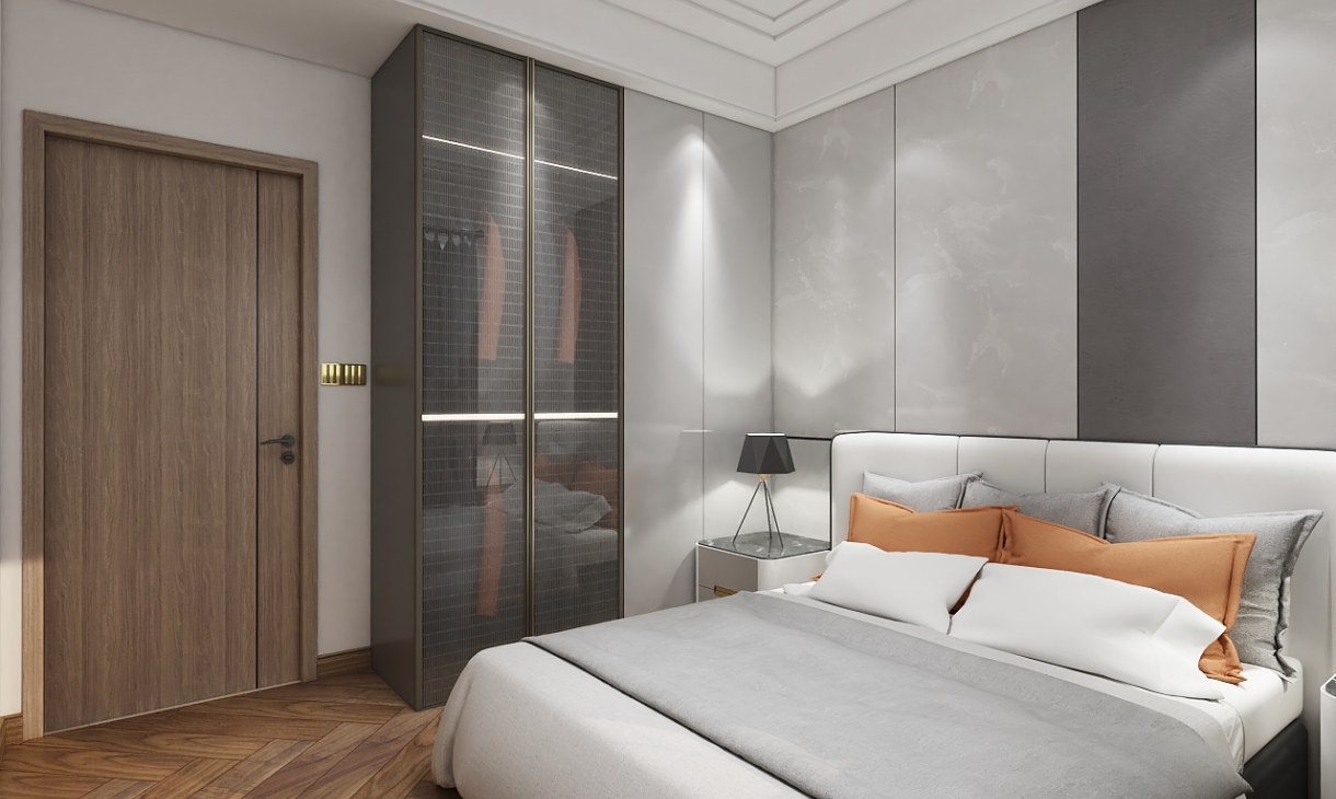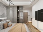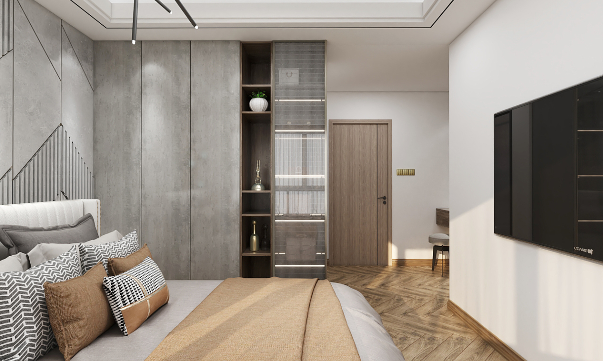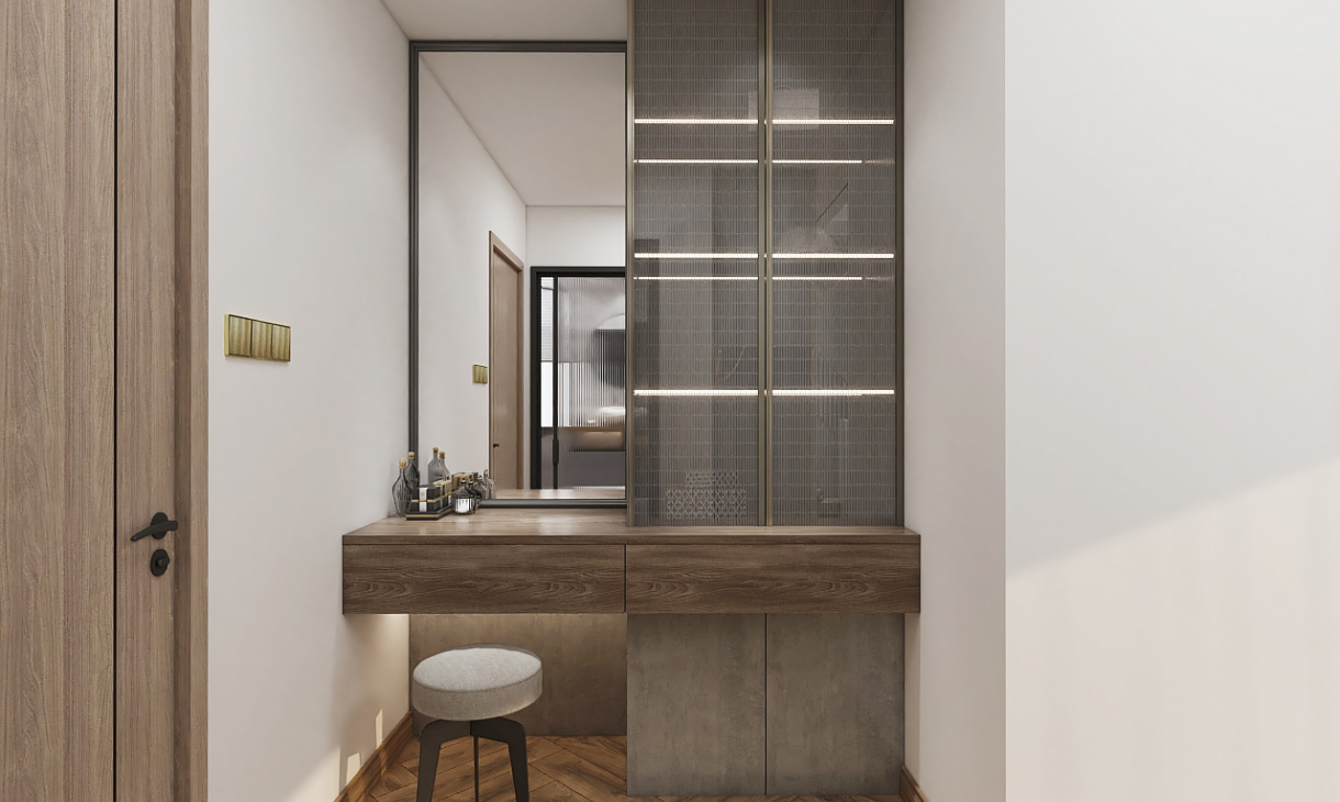 现代水泥灰的背景与水泥灰的衣柜相互呼应,悬空的床头柜更是添加了几分轻盈。进门小空间设计成了女性专属小空间。化妆区+包包区让女性一眼心动。