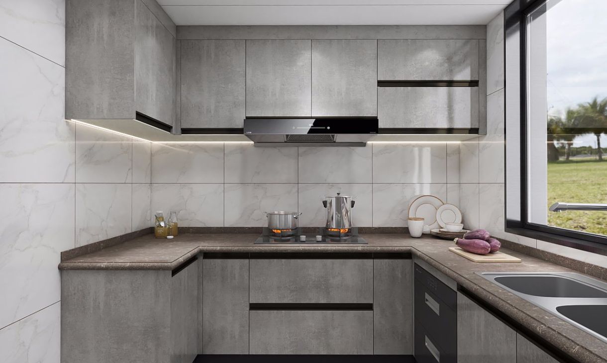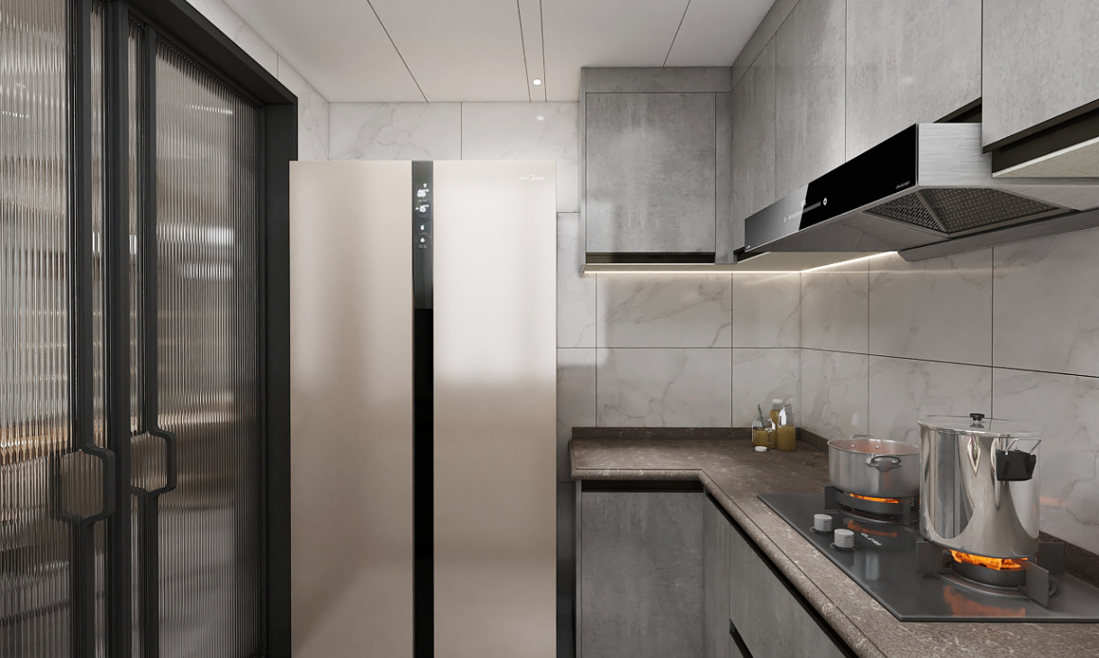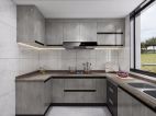 厨房空间最大化利用,做成了U型结构,深灰色的颜色搭配明亮的白色瓷砖,整体厨房明亮清晰,结构合理