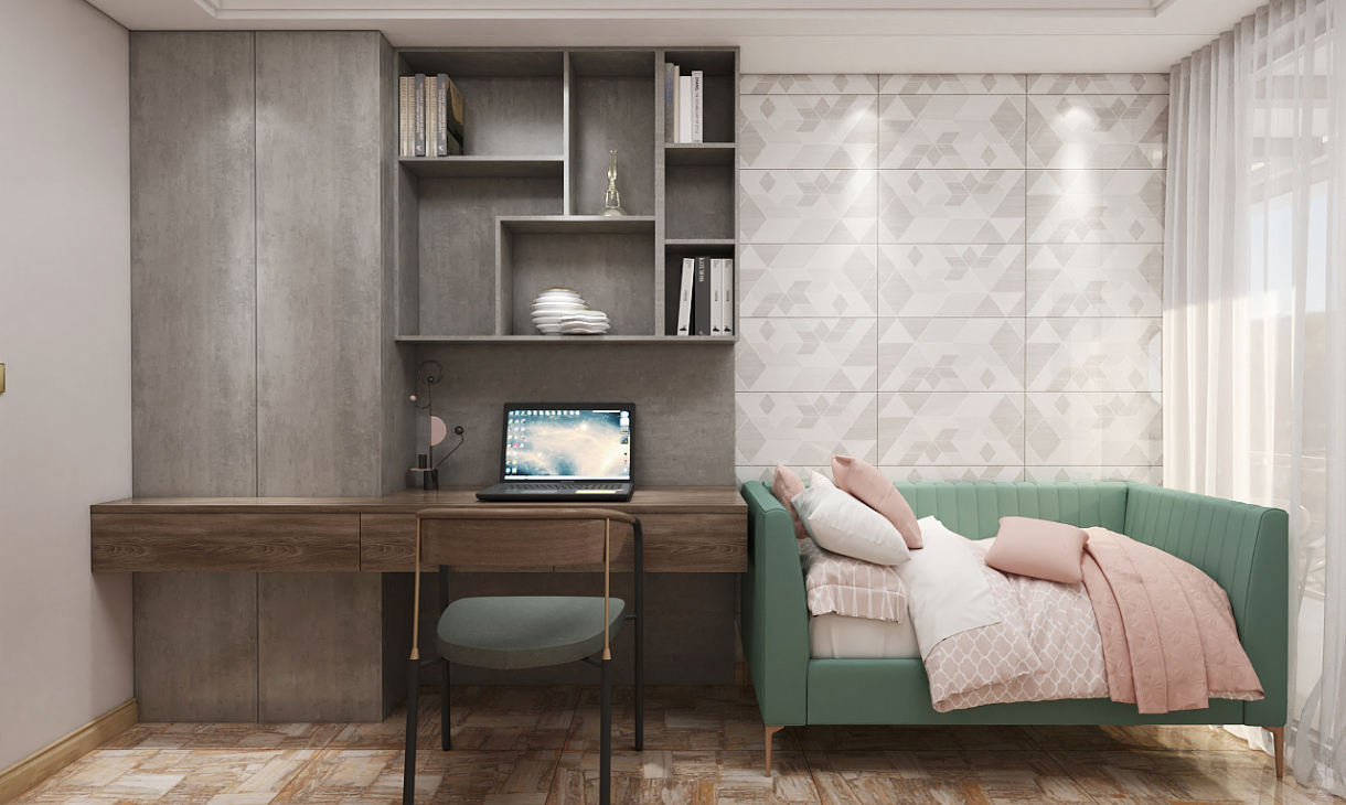 客卧采用青色和橙色搭配主色调灰色。为整体空间添加一丝活力。