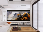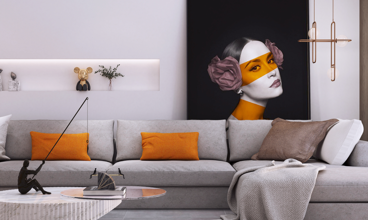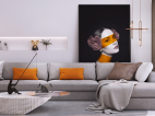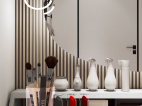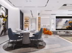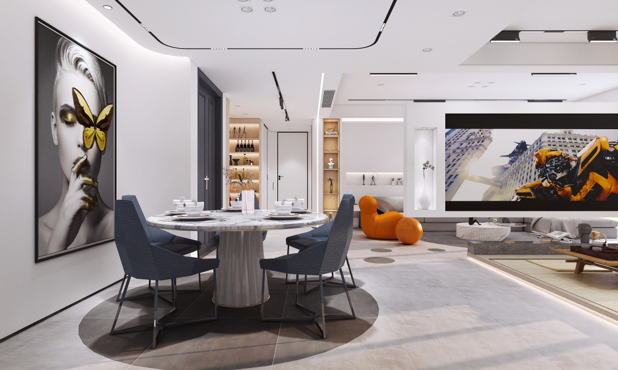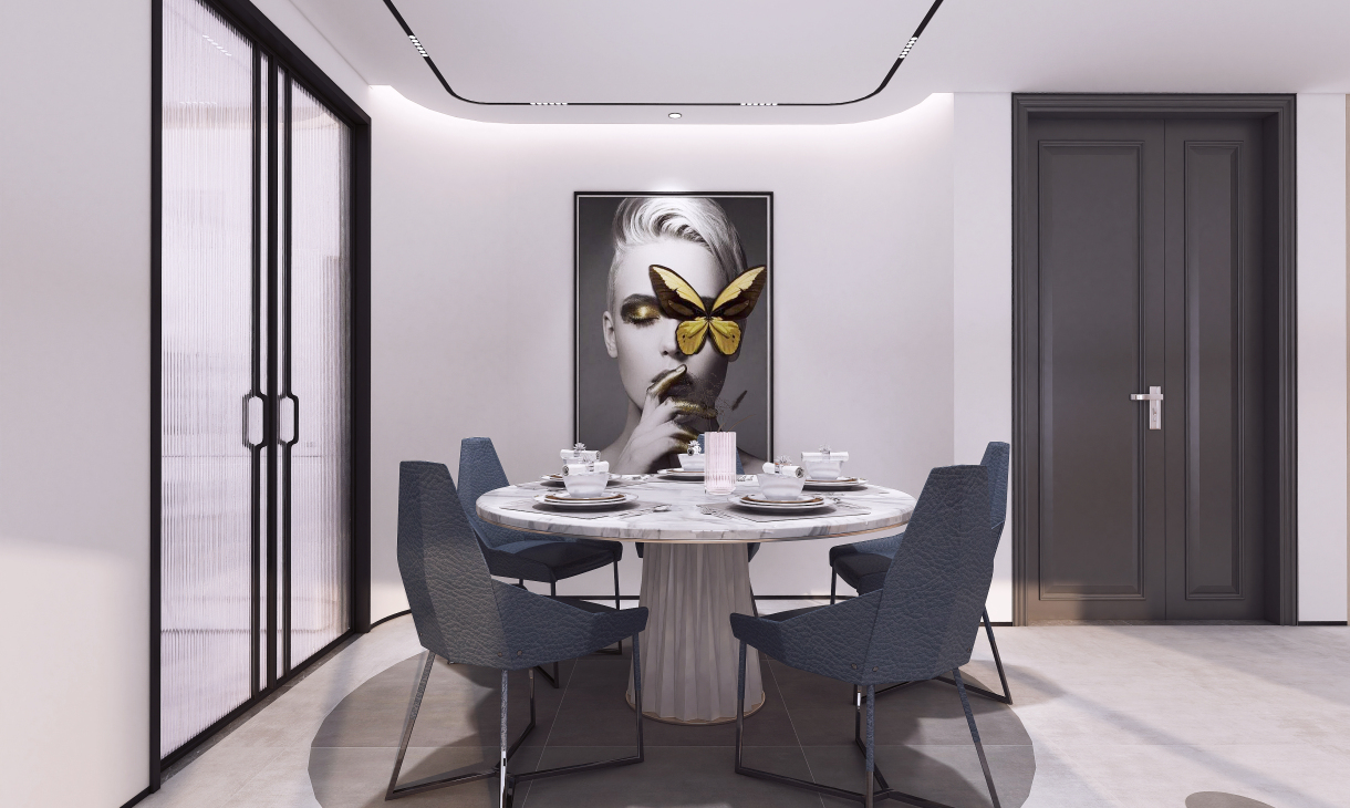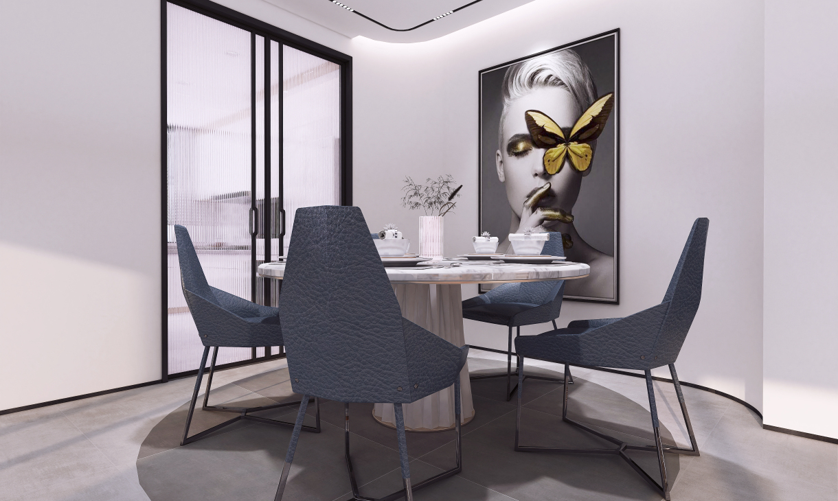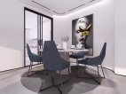开放且独立的餐厅,当然少不了一幅装饰画。蓝色与灰白色的出现,给原本的中性色彩空间,带来鲜明有趣的丰富度。