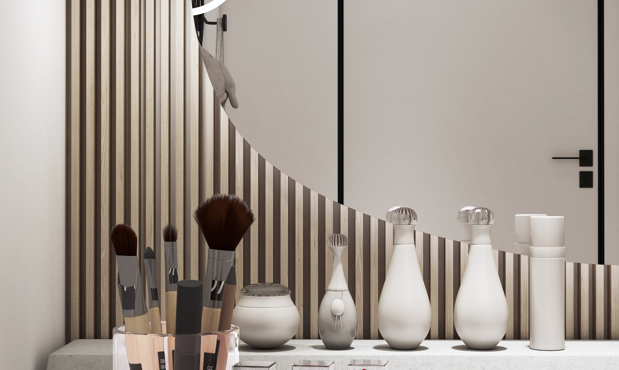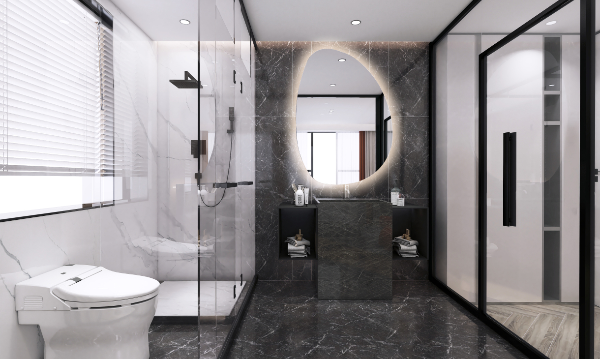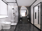 主卫空间的重新规划增加了面积,让使用功能十分充足,铝框雾化玻璃门搭配黑色柜体,柜体中都内嵌灯带,不仅补充了卫生间光源、方便日常使用也烘托了私密的氛围。 圆形的镜子反面嵌有灯带,像夜空中的月亮,黯淡却也有光。