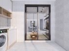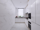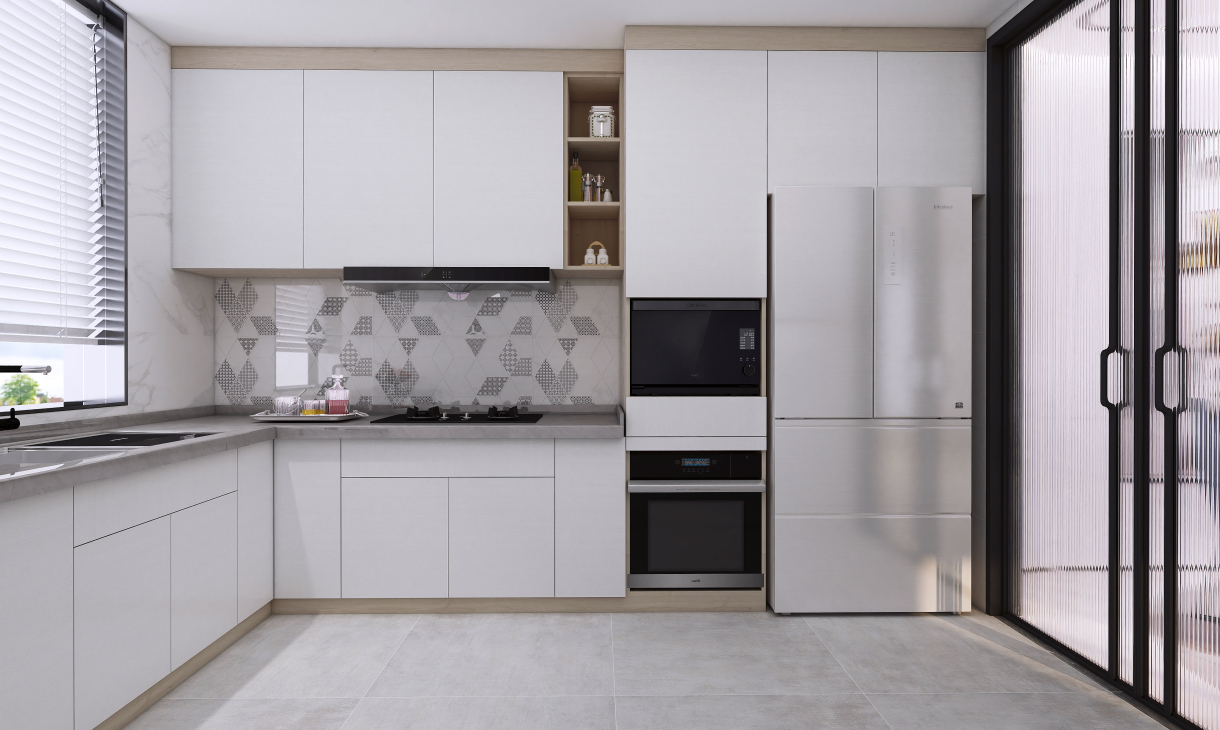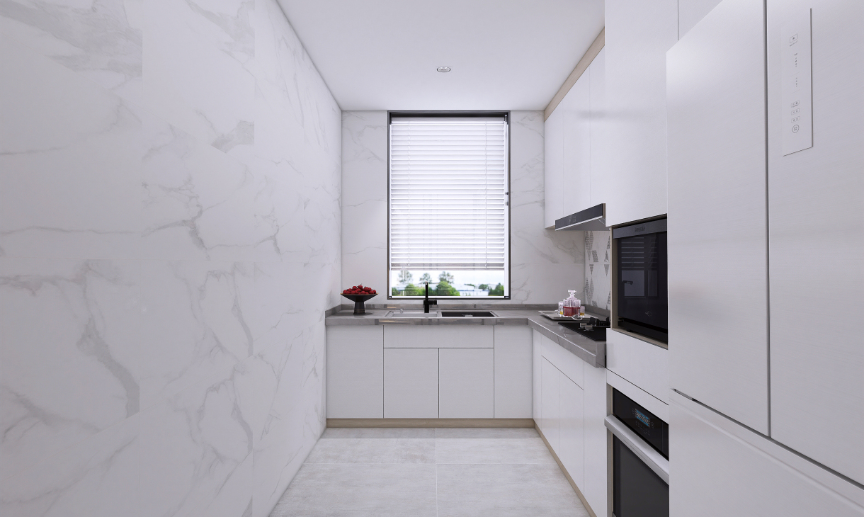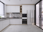 厨房的玻璃移门前后,有柜体补充收纳,并且将冰箱,蒸、烤箱等厨房家电嵌入其中,节省空间,让小空间的整洁观感更加舒适。厨房中白色的橱柜衬托在白色的墙砖与花砖之中,颜色上适宜的节奏感可以让小空间摆脱局促感。