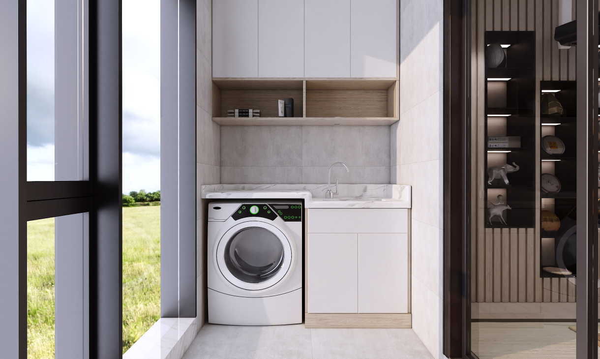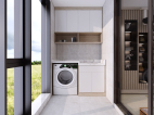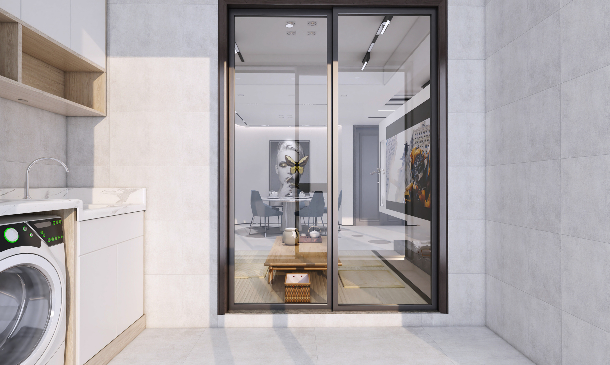 阳台的空间很宽敞,主要作为洗衣晾衣的功能。阳台的墙体是浅灰色,有层次的色调组合之下并没有让空间黯淡,只显出深层次的质感。