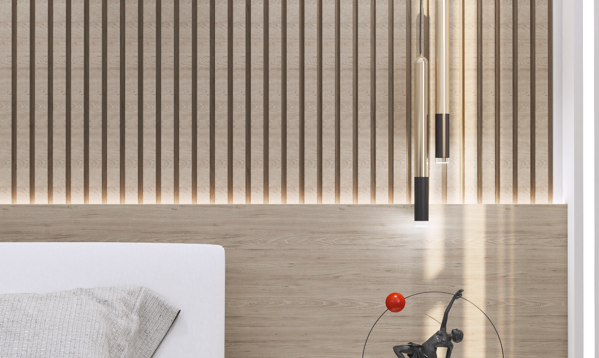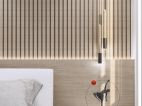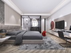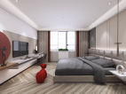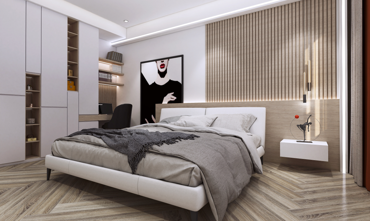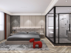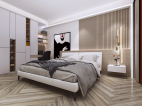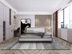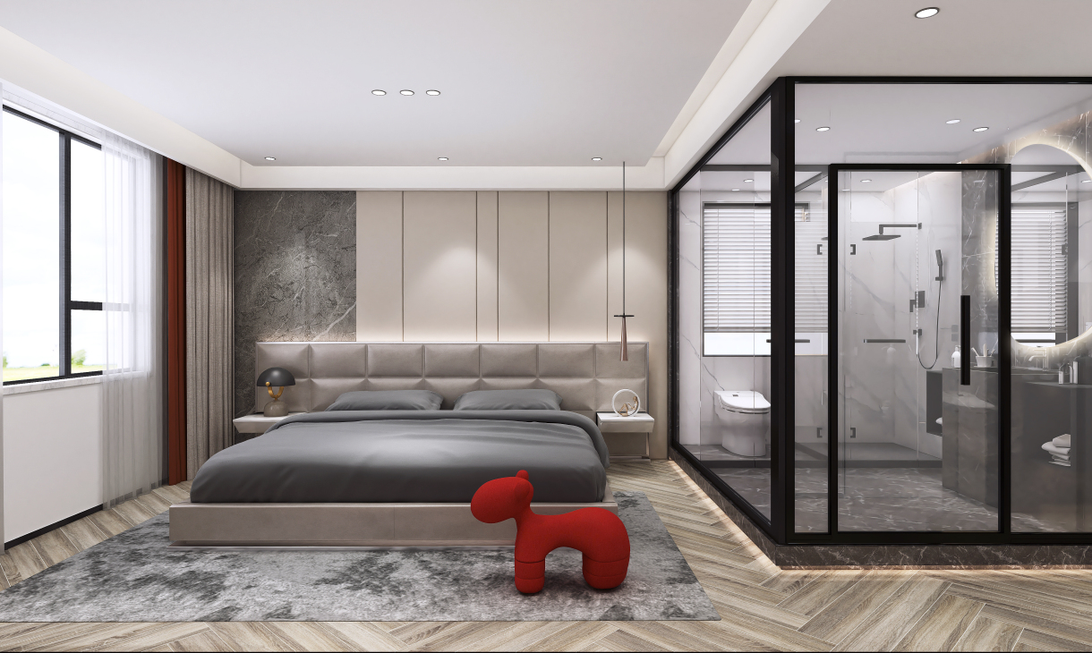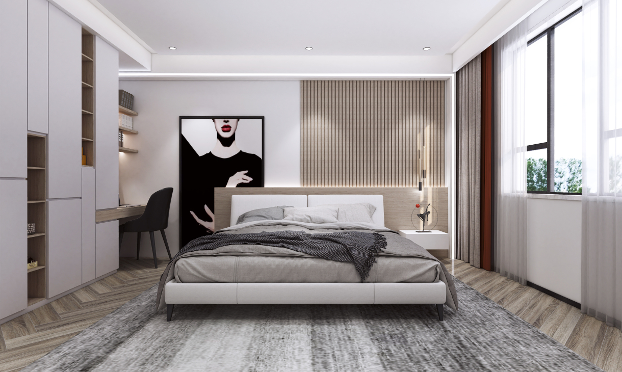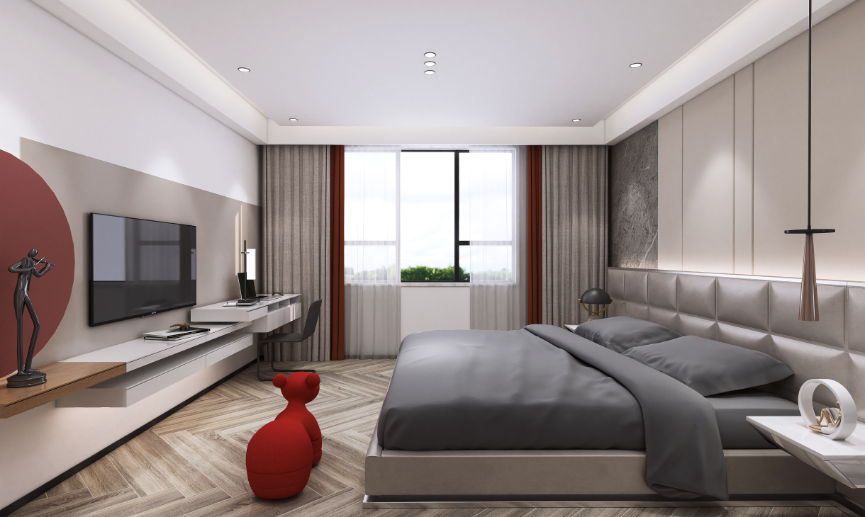 主卧较于大空间我希望更为沉稳,采用的大面积的人字拼地板,大色调是暖白色,床品和背景的一抹红色是这个卧室空间的点亮色,增加空间质感。灰色床品让整个空间色调统一,红色又起到画龙点睛的效果,卧室就是给人一种沉稳静谧的感觉。
