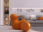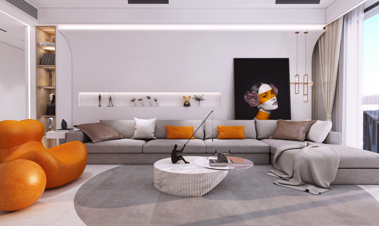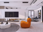 客厅是这个家庭的生活重心,开放、流动的手法糅合充足的采光。空间用色干净、简约,层次分明。白色、橙色两种主题色相得益彰,身处其间,似乎有云有海环绕,让人不禁放松、静心。