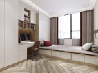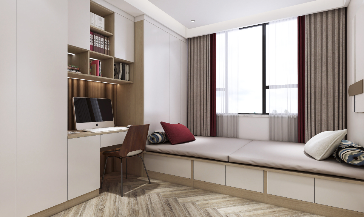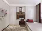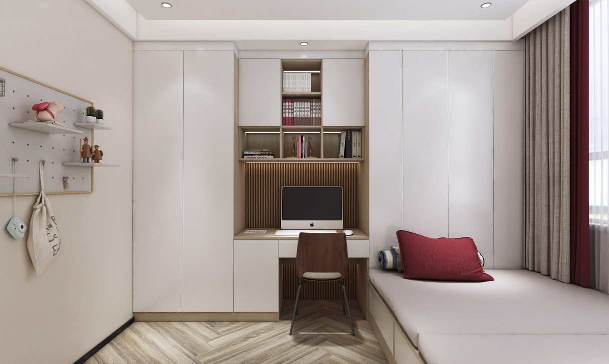 次卧延续了客厅的风格,以暖白色为主调,配上原木色柜体,凸显的整个空间更加静谧,安静。。