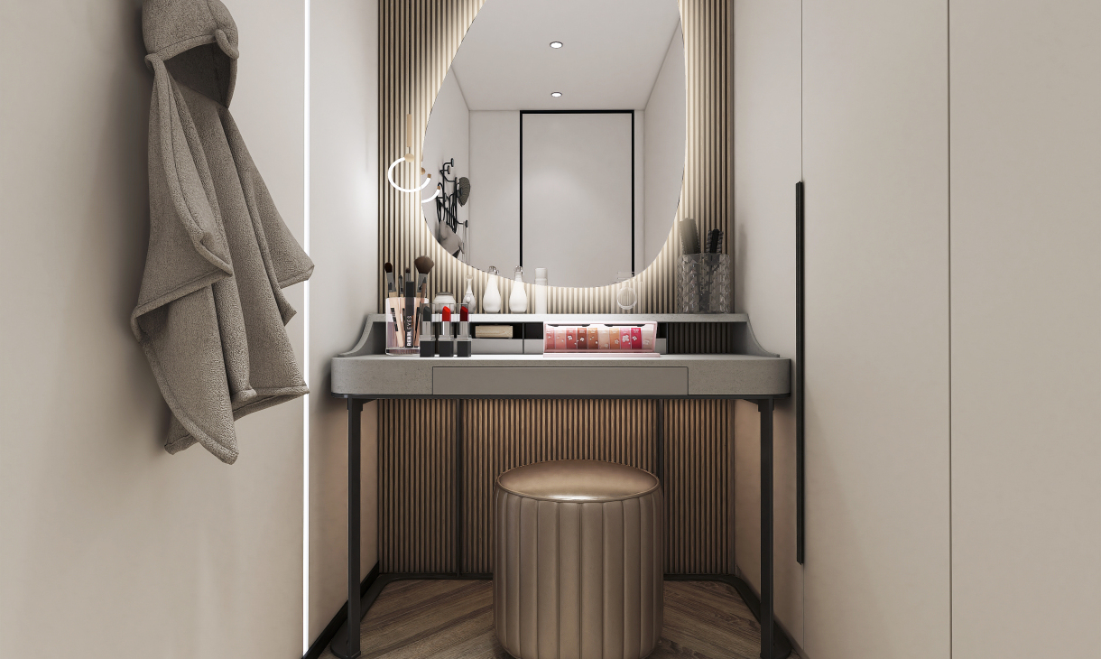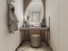 衣帽间及梳妆台可以说是为女主人量身定做,吊灯和线性灯使整个空间气质升华。