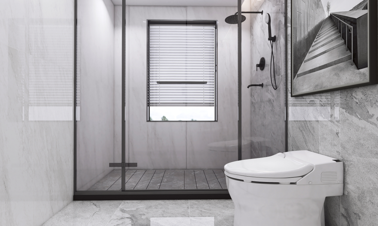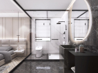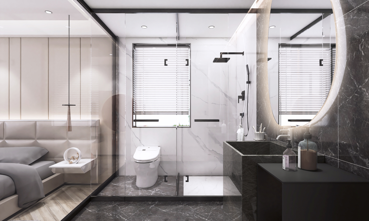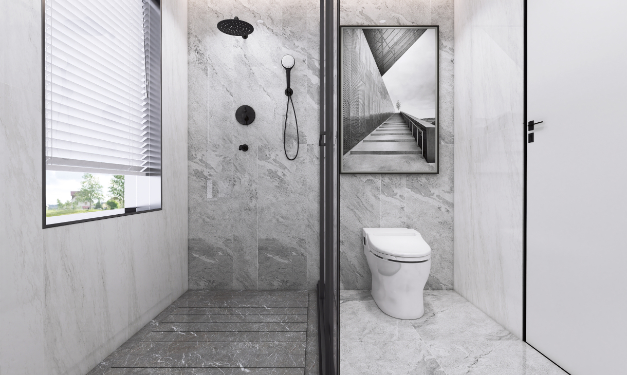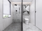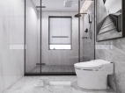 客卫用色与线条都十分简洁利落,灰白相间的配色,在马桶与淋浴的墙上做了简单的错缝铺贴,满足美观的同时,也解决了砖块铺贴出现小块的弊端,使得空间简约又不失优雅,这种感觉随着洒入的阳光,在空间中蔓延……