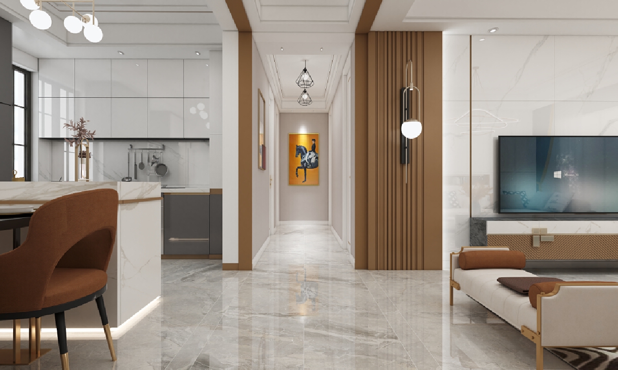 轻奢风格的空间以金属、皮革的中性色调为主,用色彩的纯度传递细腻的质感。造型简洁,线条流畅的家具组合搭配,营造出稳定、协调、温馨的空间感受,满足现代年轻家庭的轻奢需求。