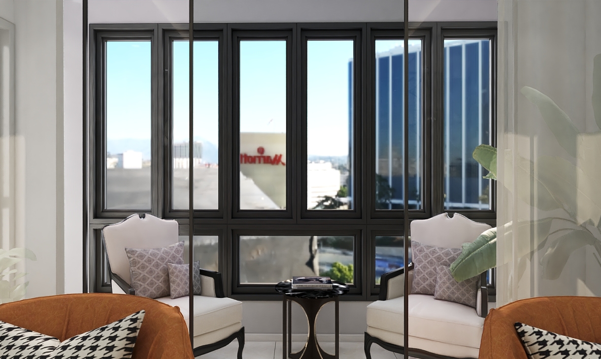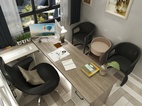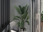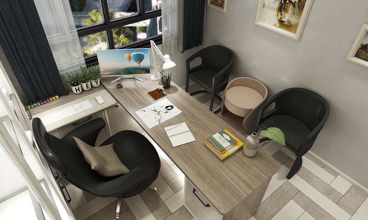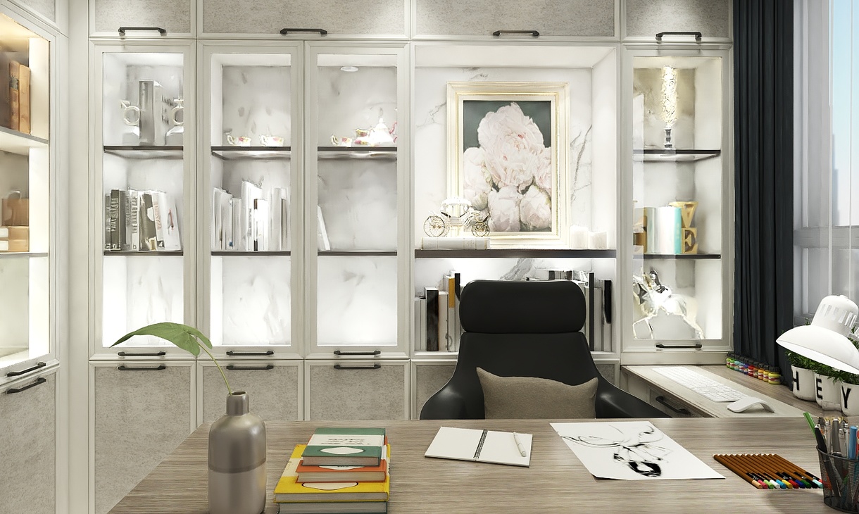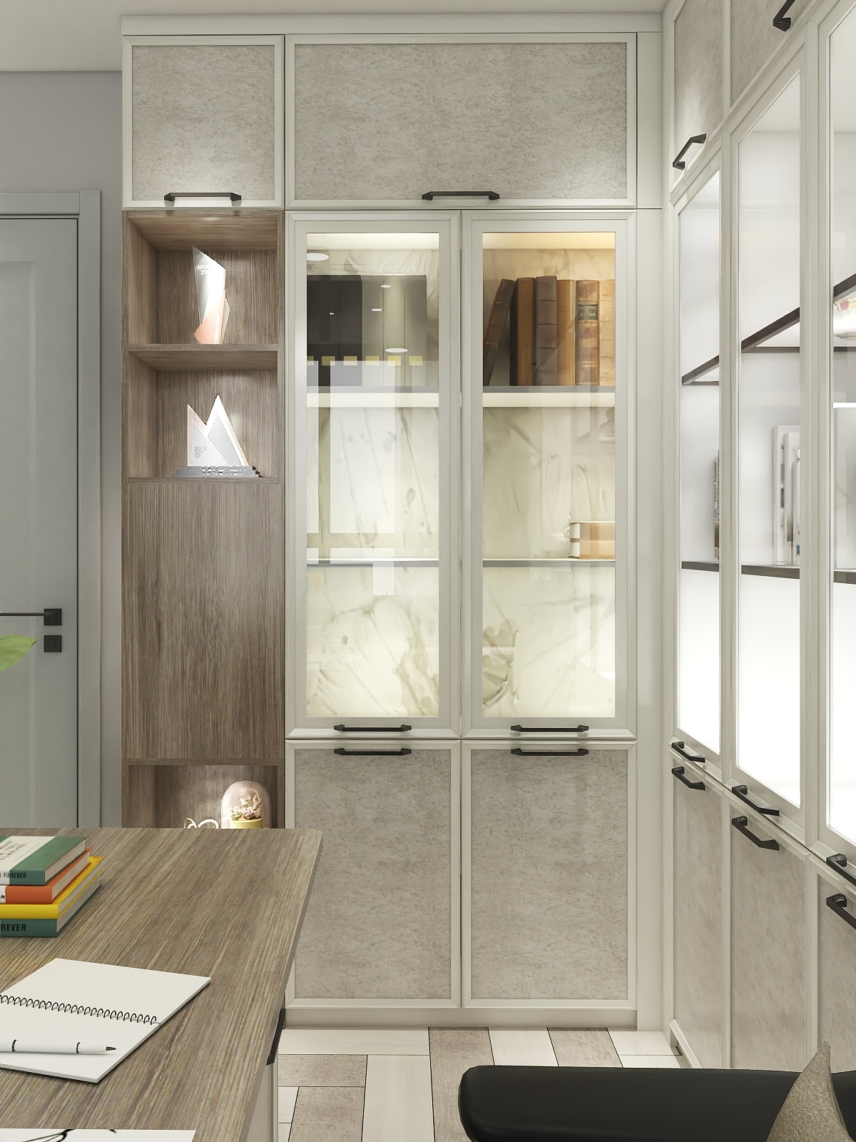 中性灰色墙面搭配仿木纹色地砖,整体空间静谧又有活性,窄边框暖色石纹板加上玻璃框门板满足安静办公的需求又不压抑思感与自然的亲近。空灵通透,如爱般纯粹自然。