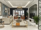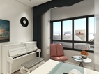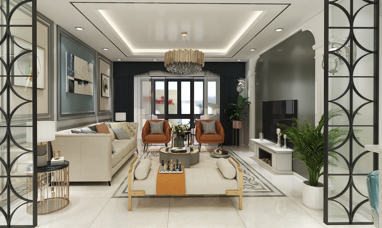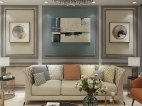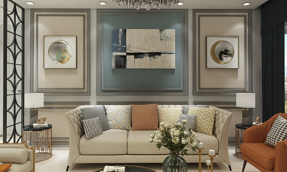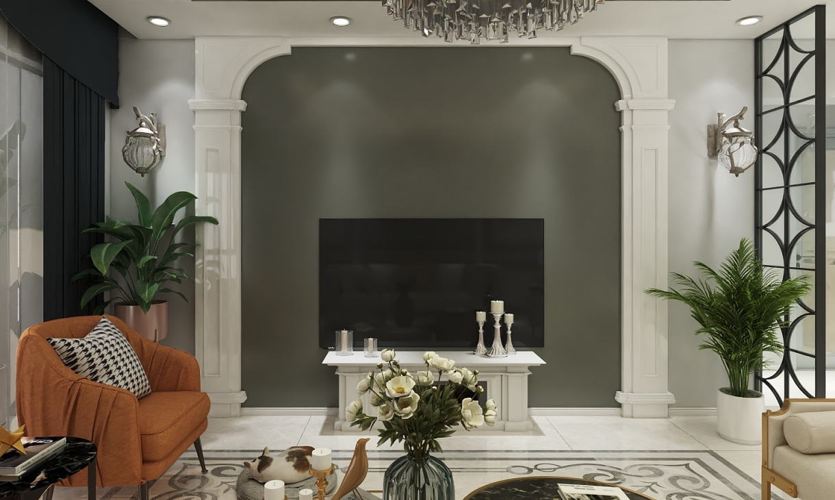 象征性的柱式与壁炉,简约的灰色线框即装饰了墙面又分割了灰色墙面,墙面及家具点缀了米色、蓝色、墨绿和橘色使得整体平淡的空间多了一份温馨。