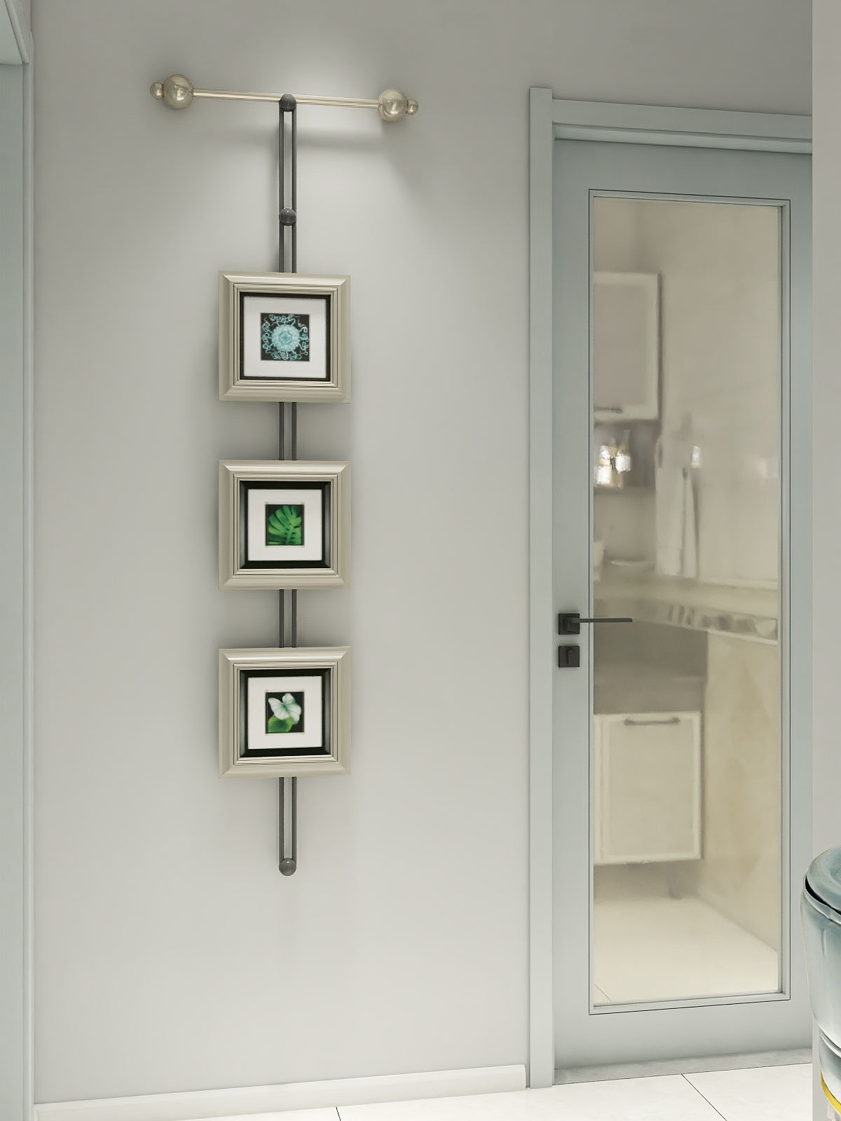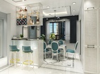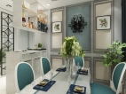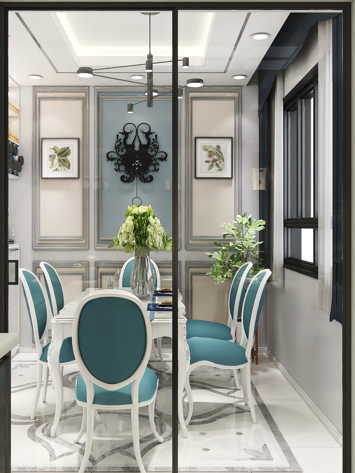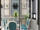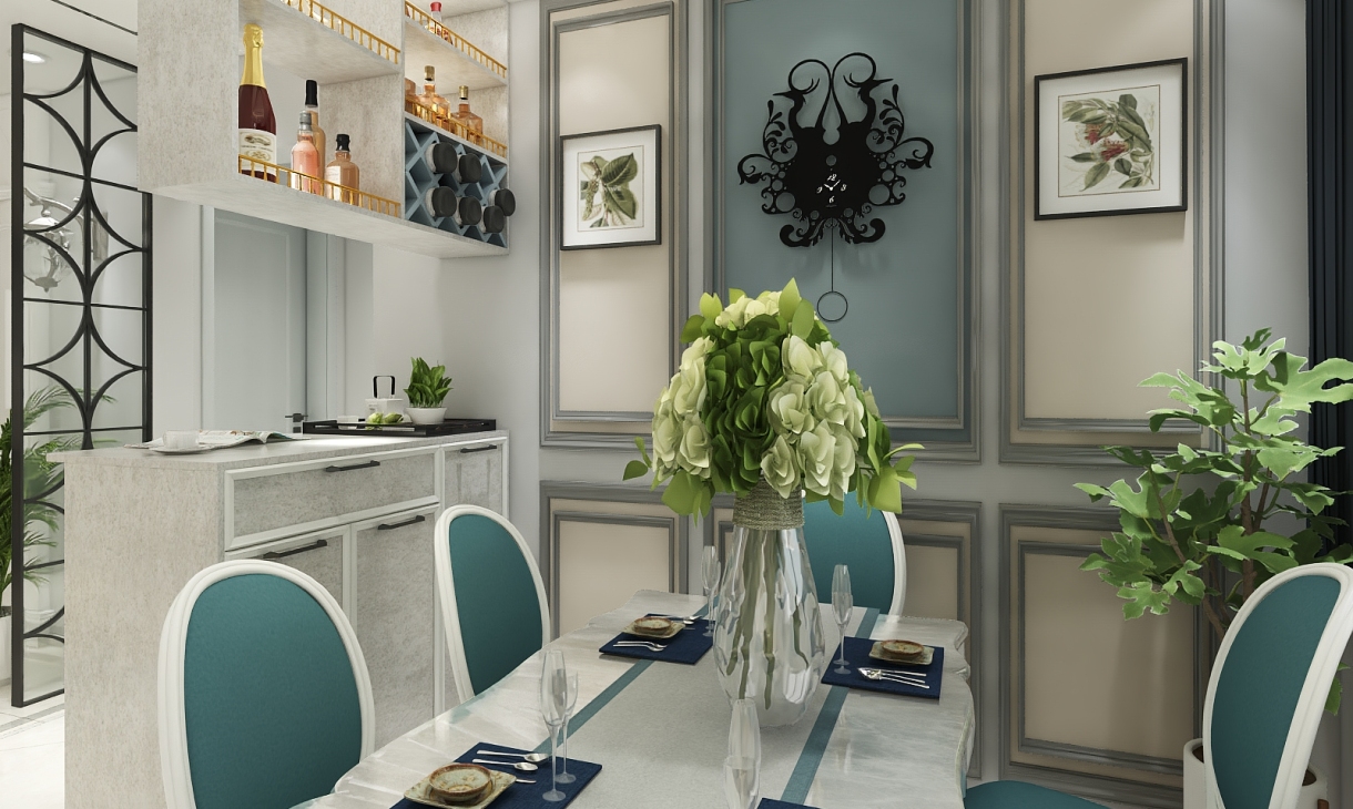 简约的灰色线框即装饰了墙面又分割了灰色墙面,餐桌座椅点缀高雅孔雀蓝简约又不失优雅与贵气。