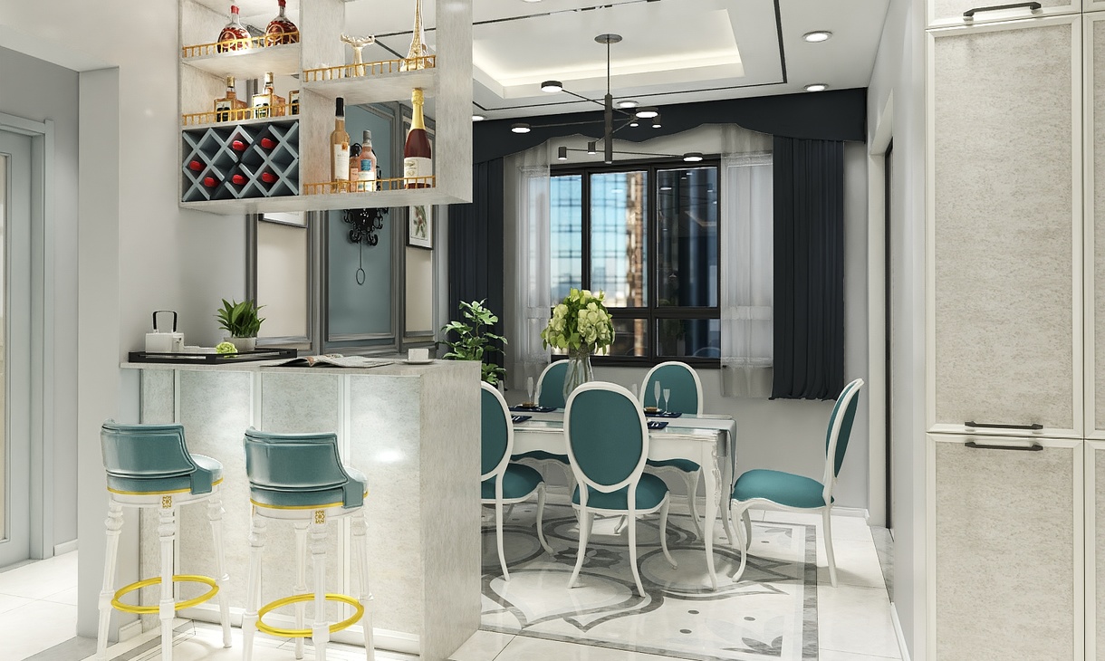 简约的拼花造型增加空间灵动。欧式铁艺玻璃,吧台及悬吊酒柜划分空间,又能满足餐后小酌。