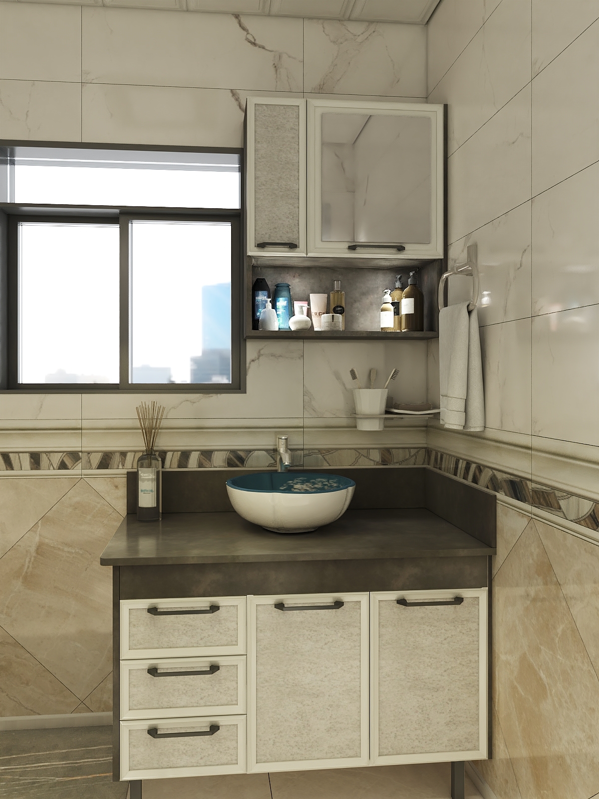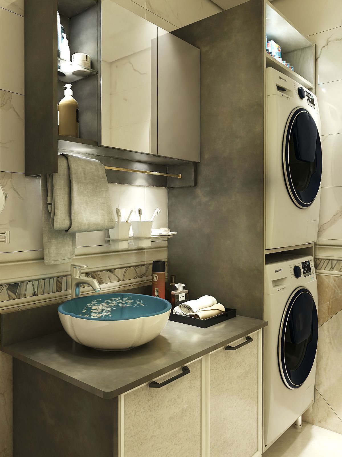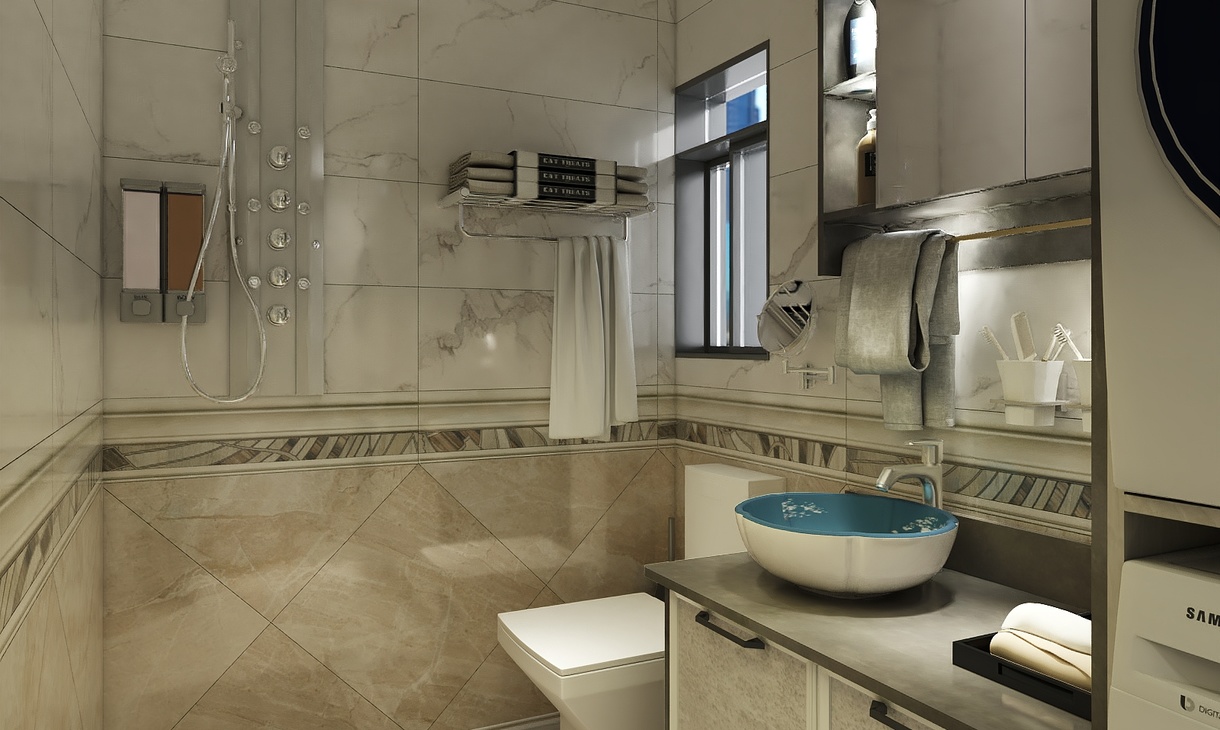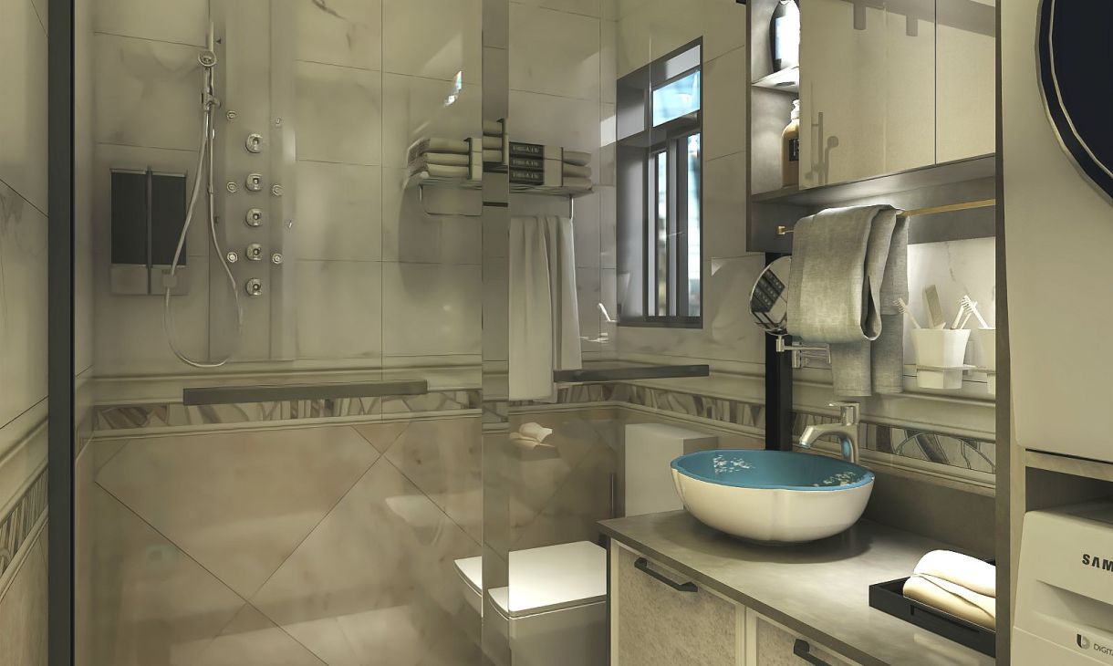 精致如你怎么会不明白衣物分开洗的道理,两台洗衣机上下叠放,最大化的利用空间,洗面台面面俱到,可通透,也可做干湿分离设计,向左向右,总能走到心底。
