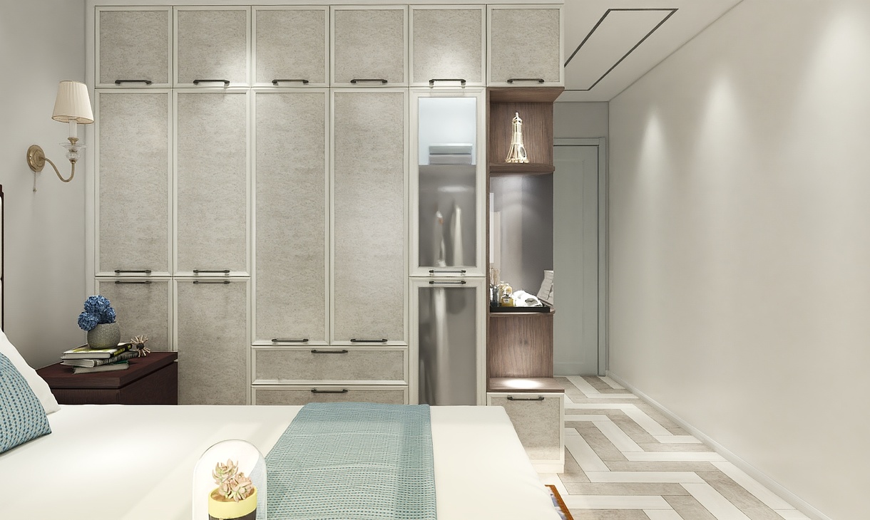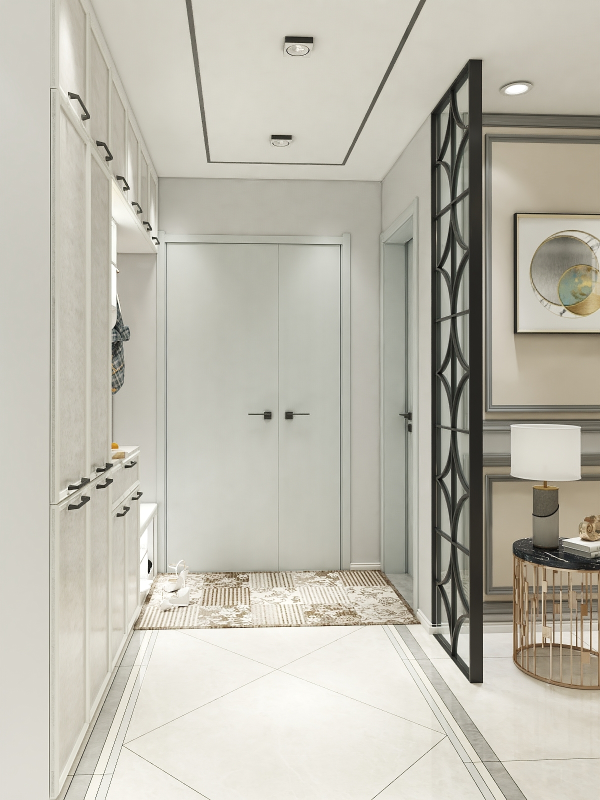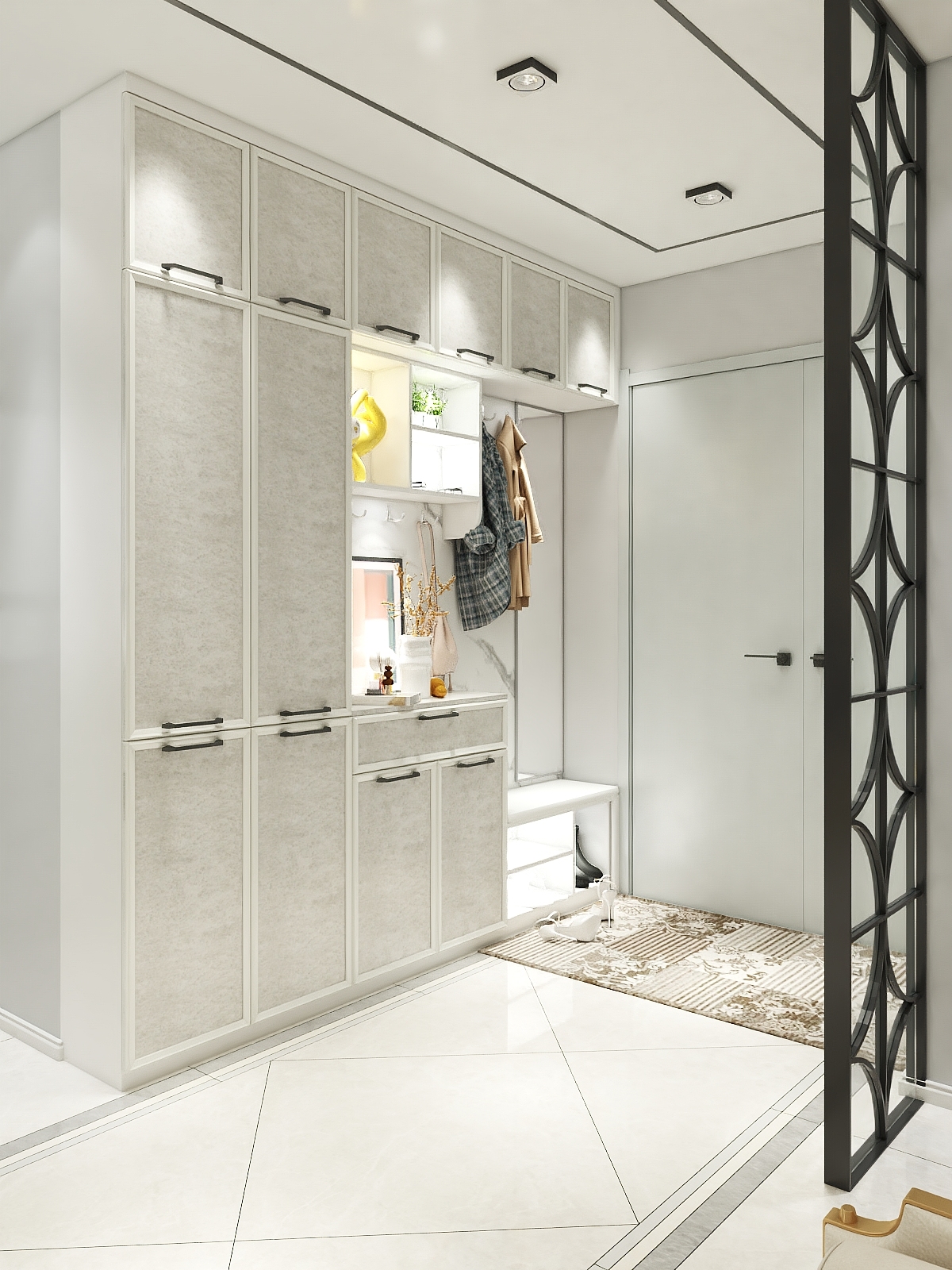 衣柜,鞋柜、着装镜、换鞋凳、随手搁置钥匙的抽屉与挂衣区,简易仪容区,满足出入的所有需求,也许出双入对这才是我们所追求的浪漫生活。