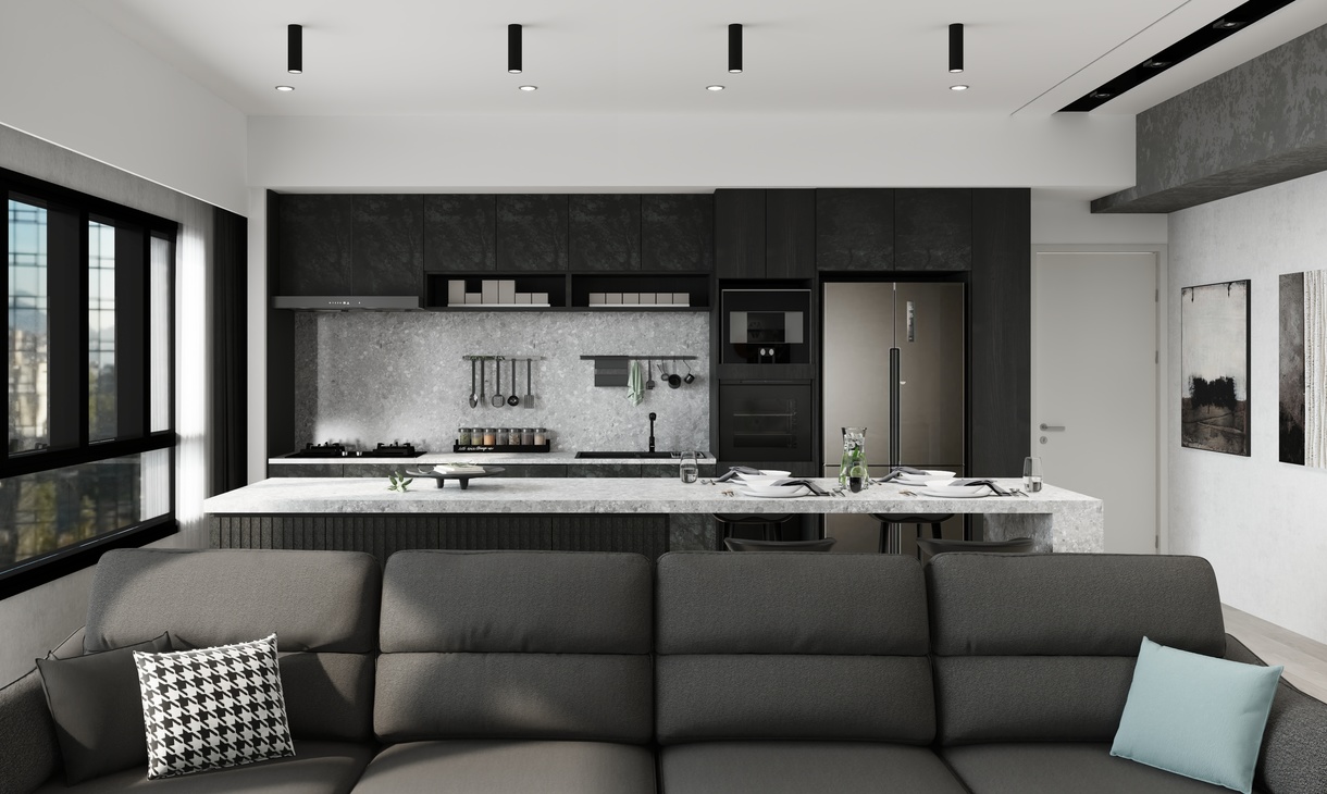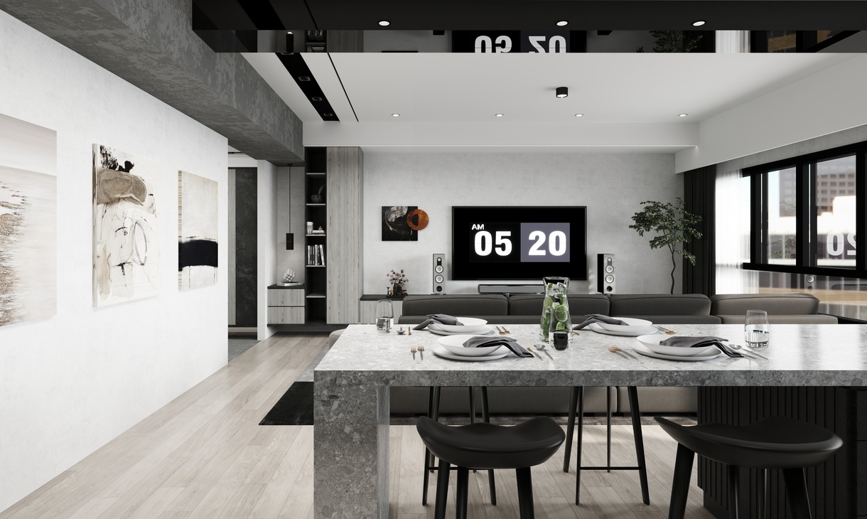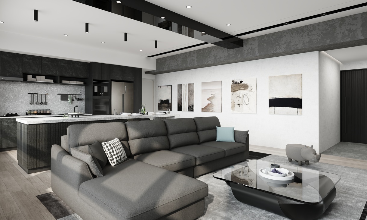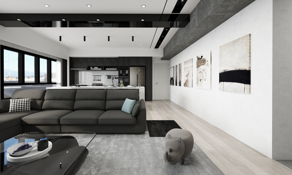 【空間】:玄關+客廳+餐廳 【風格】:現代 + 黑白風 【坪數】:16坪 16坪的空間,將現代風格與黑白簡約美學融合在一起,透過精心安排的材料紋理,打造出沈穩優雅的客廳和餐廳空間,彰顯極致的精緻與氣勢。 在這個空間中,材料紋理的運用扮演著關鍵角色。牆面選用特殊漆,透過師傅手感抹繪出獨一無二的質感,黑白交織的紋理為空間增添了層次感。地板則選用高品質的木質地板,紋理自然,營造出溫暖的氛圍。家具以黑色金屬和玻璃搭配,透過不同的質感紋理,為空間注入了現代感和高雅品味。 空間的氣勢彰顯於室內設計的每一個細節。簡約的天花板設計讓空間更顯寬敞挑高,大家最避諱的大樑我面貼黑鏡,以此界定客廳及餐廳空間。過道上的大樑則是刷上深色的特殊漆,讓視覺得以延伸至臥室房門,使空間簡約大氣。 廚具大膽採用深色系統版,在白色的空間裡成為矚目的焦點,中島增加收納空間,上方檯面延伸成為餐桌,為料理增加更多使用可能。