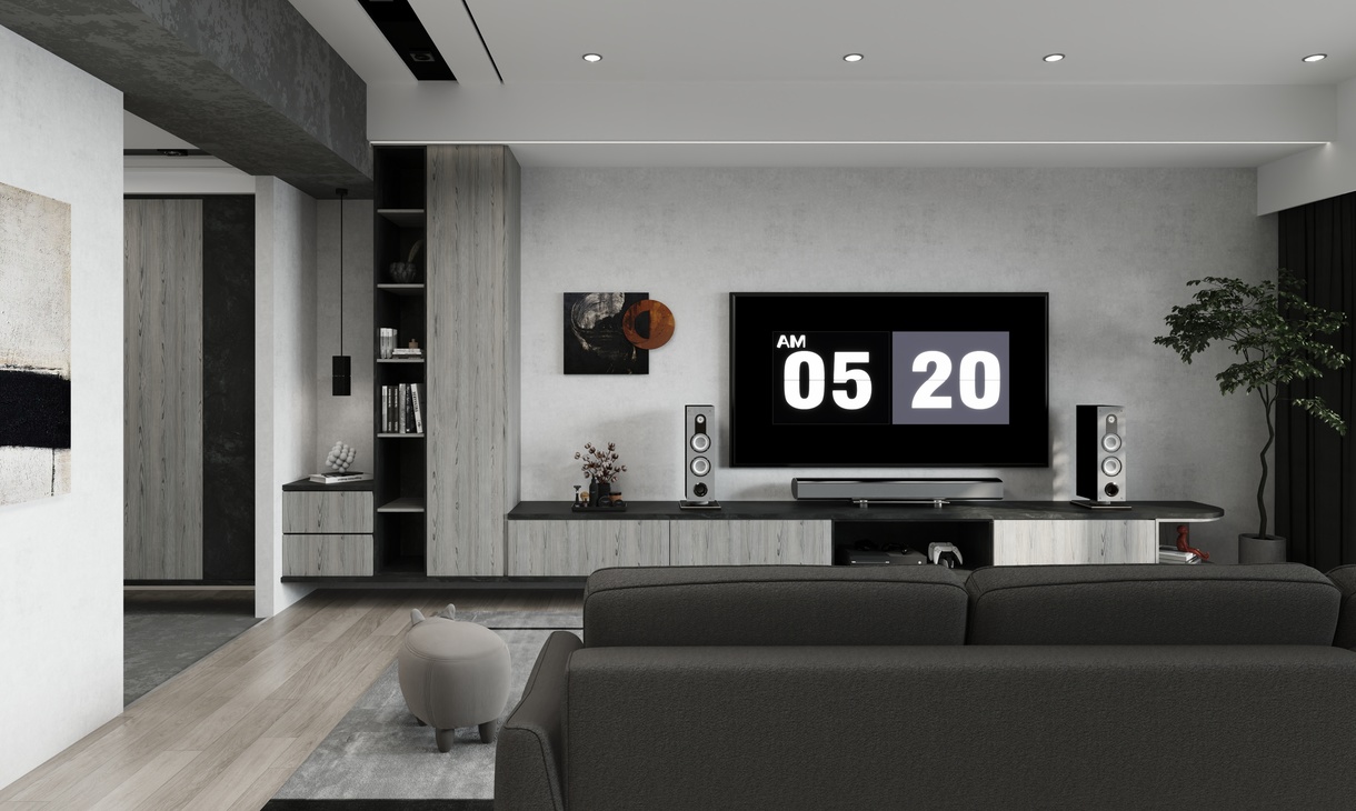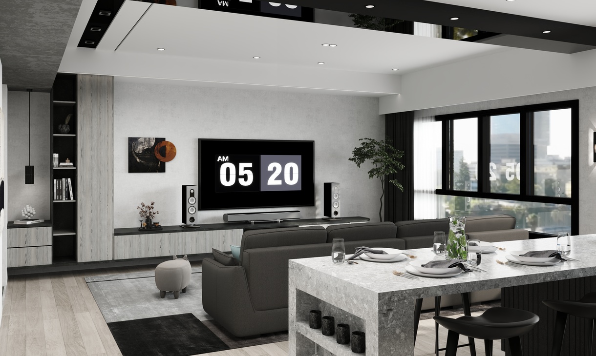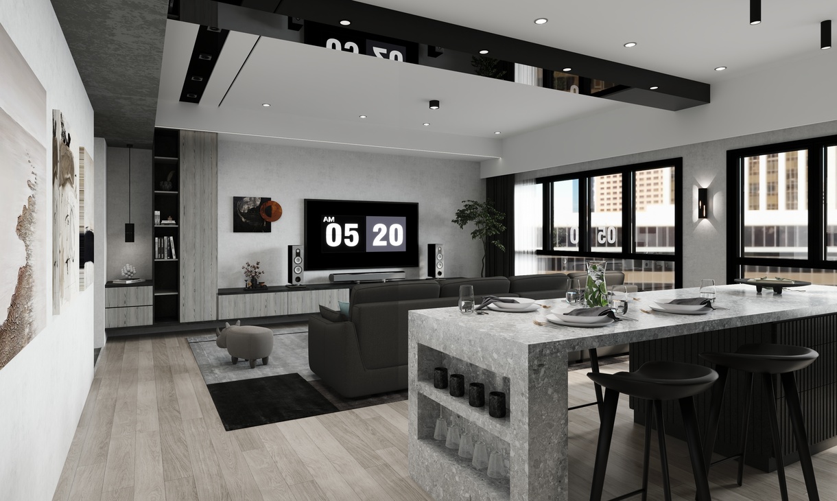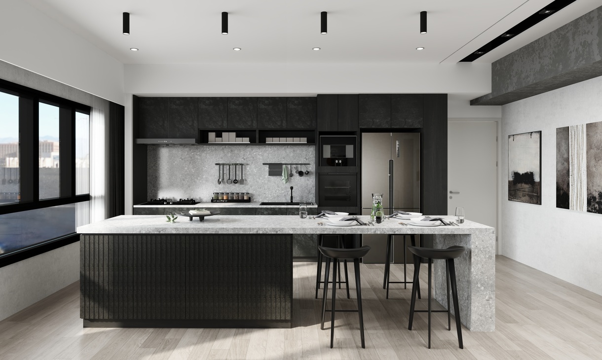 【空間】:玄關+客廳+餐廳 【風格】:現代 + 黑白風 【坪數】:16坪 16坪的空間,將現代風格與黑白簡約美學融合在一起,透過精心安排的材料紋理,打造出沈穩優雅的客廳和餐廳空間,彰顯極致的精緻與氣勢。 在這個空間中,材料紋理的運用扮演著關鍵角色。牆面選用特殊漆,透過師傅手感抹繪出獨一無二的質感,黑白交織的紋理為空間增添了層次感。地板則選用高品質的木質地板,紋理自然,營造出溫暖的氛圍。家具以黑色金屬和玻璃搭配,透過不同的質感紋理,為空間注入了現代感和高雅品味。 空間的氣勢彰顯於室內設計的每一個細節。簡約的天花板設計讓空間更顯寬敞挑高,大家最避諱的大樑我面貼黑鏡,以此界定客廳及餐廳空間。過道上的大樑則是刷上深色的特殊漆,讓視覺得以延伸至臥室房門,使空間簡約大氣。 廚具大膽採用深色系統版,在白色的空間裡成為矚目的焦點,中島增加收納空間,上方檯面延伸成為餐桌,為料理增加更多使用可能。