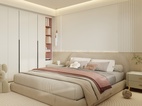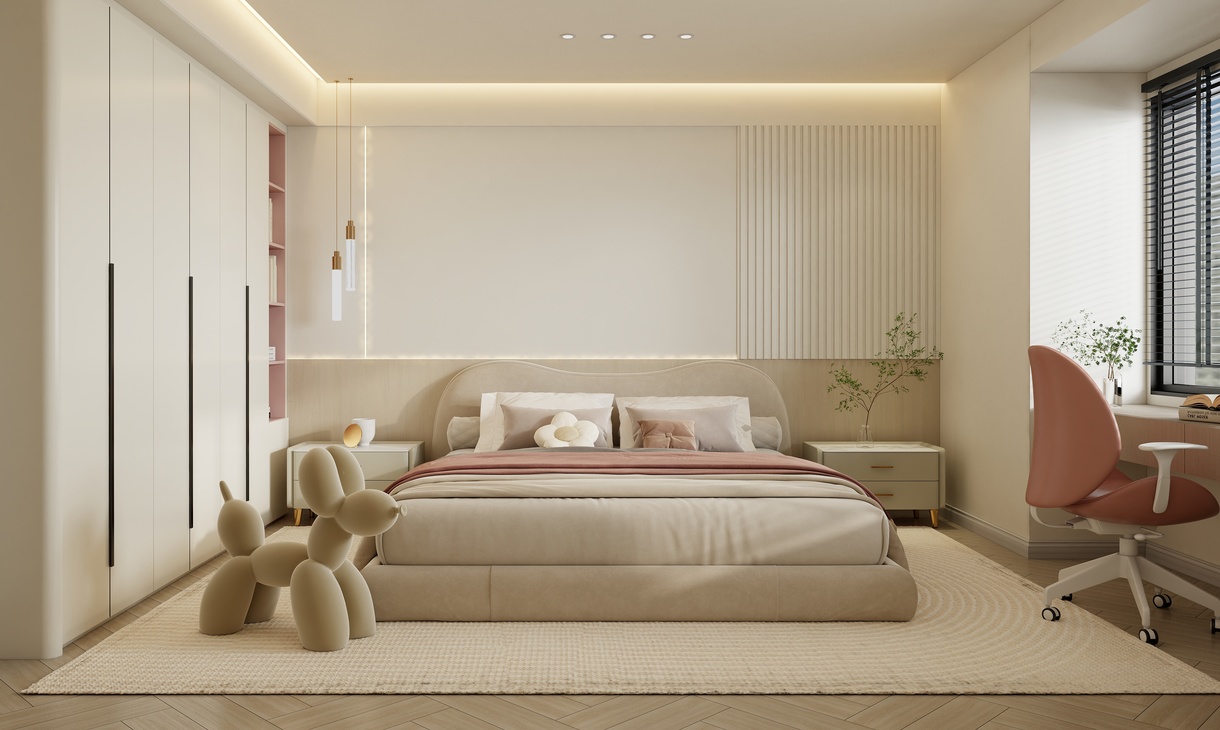 现代奶油色系、粉色、白色和米色的室内装修可以创造出一个温馨、浪漫且充满生机与活力的居住环境。