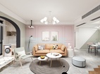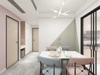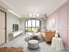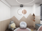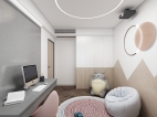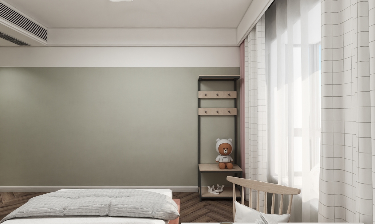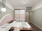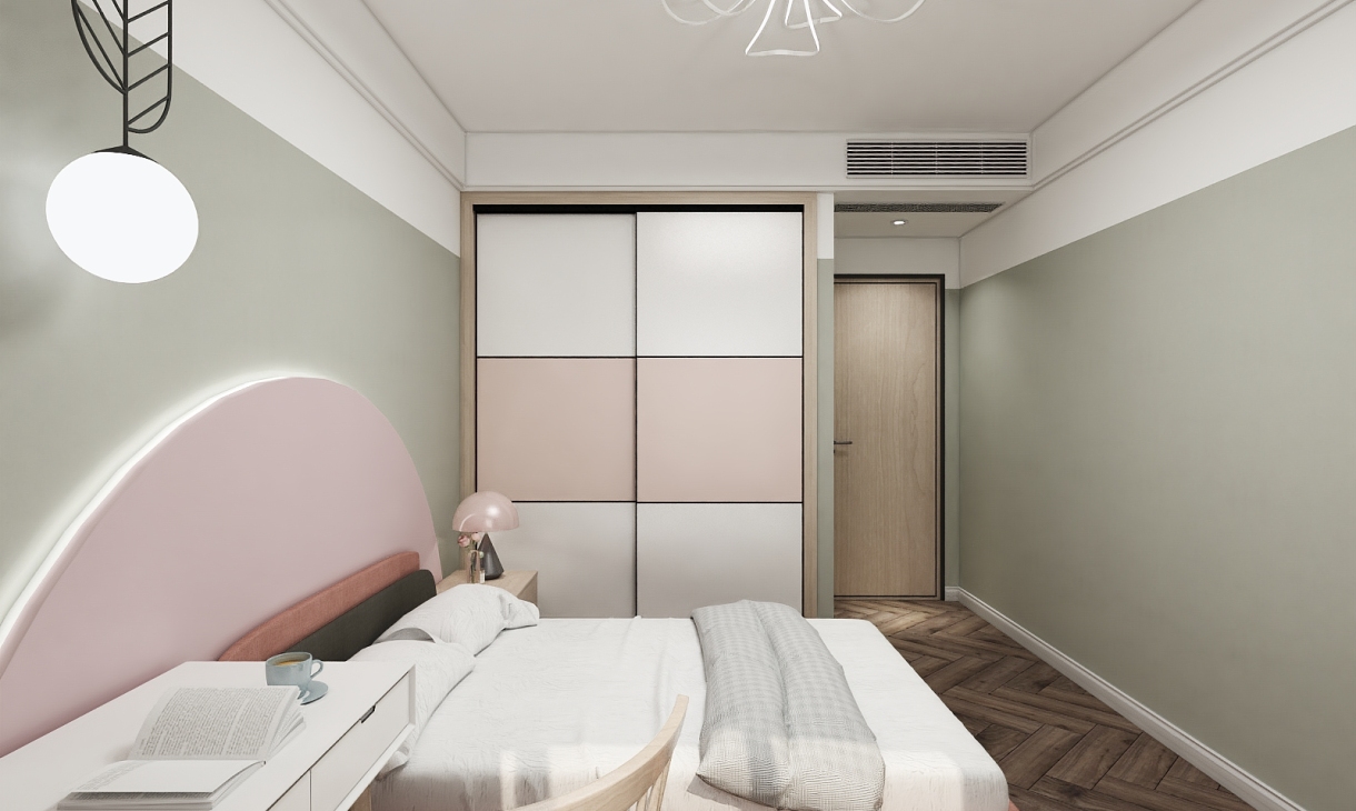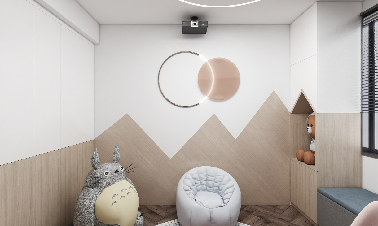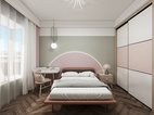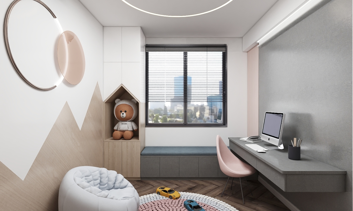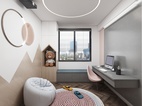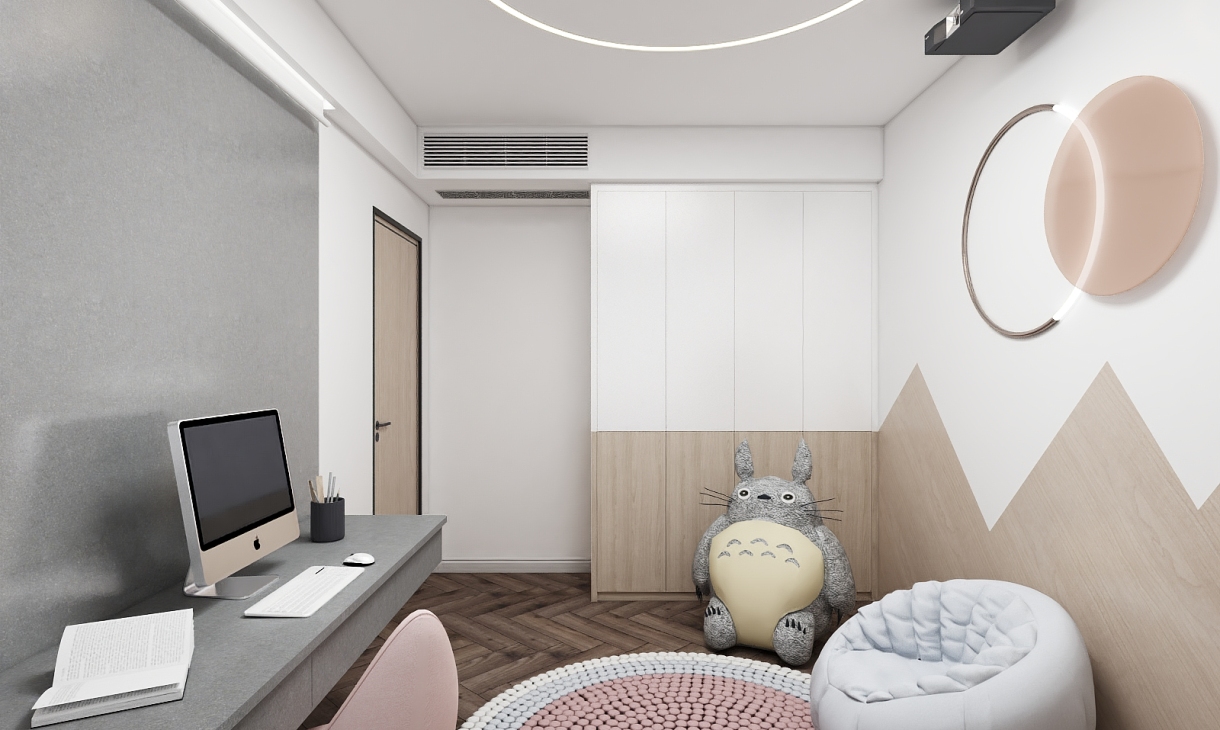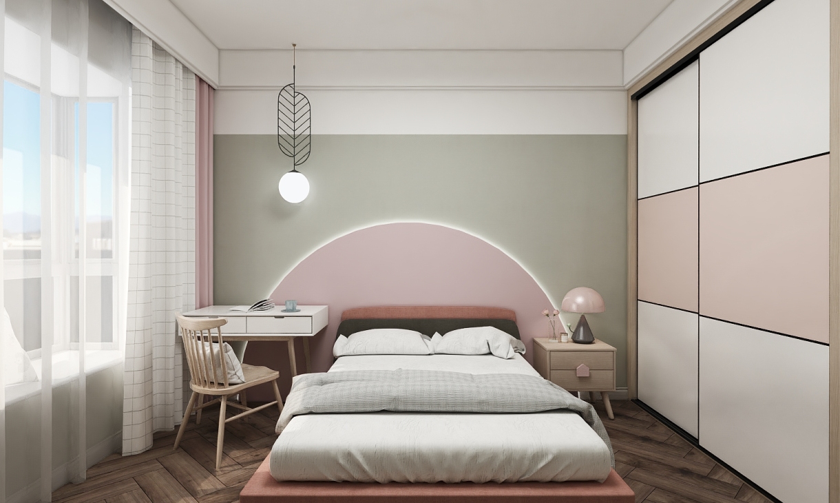 儿童房房设计为女儿房,采用粉+绿的配色,半圆背景配以灯带来提升氛围。