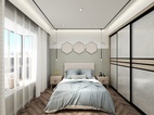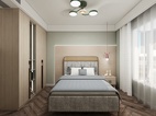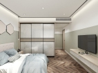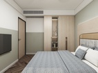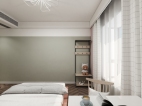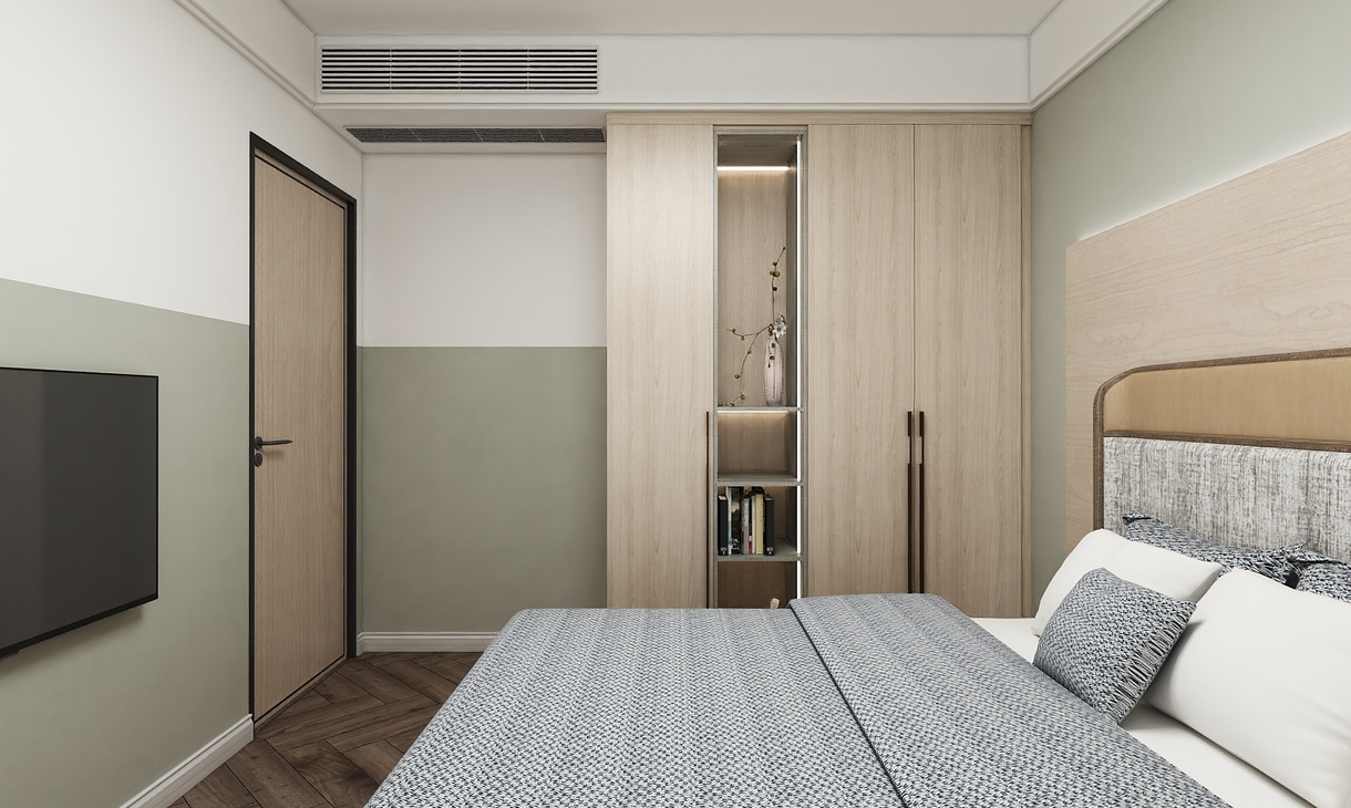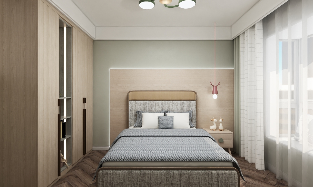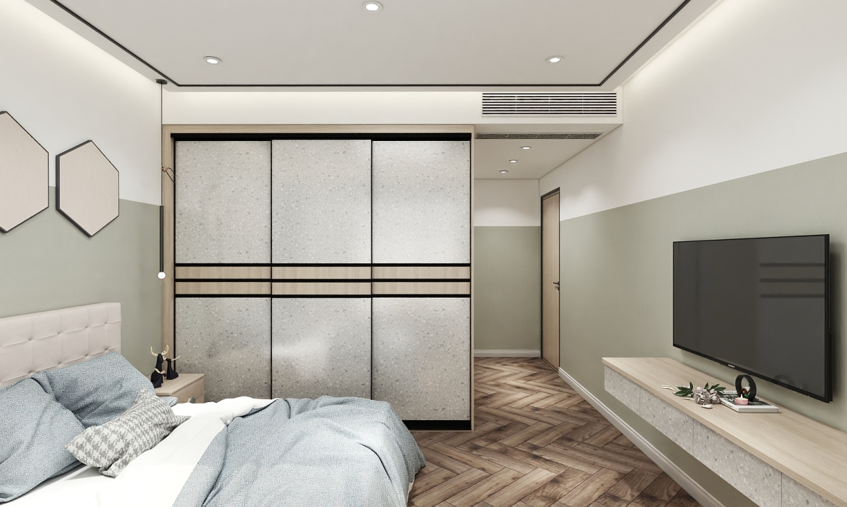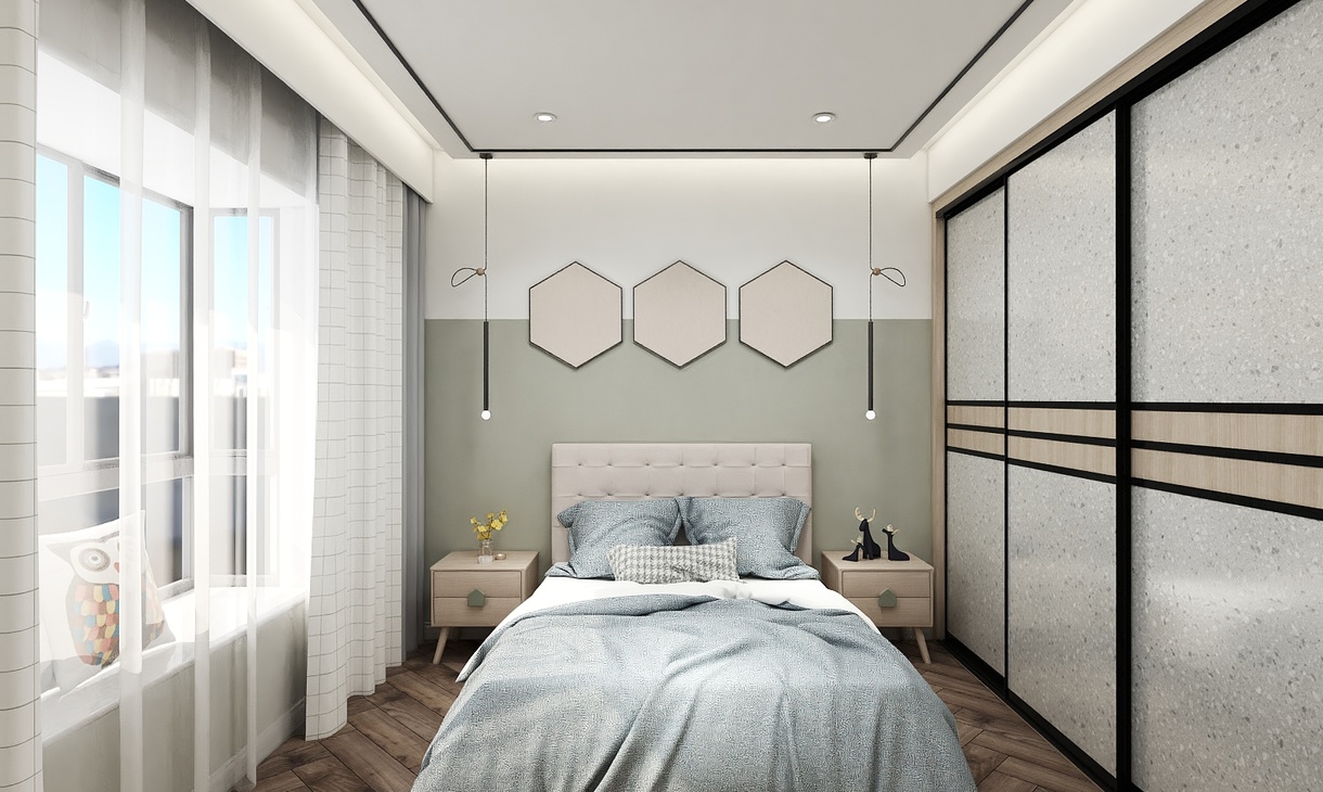 主卧的设计简约大方,浅绿色墙面搭配蓝色床品,辅以水磨石移门、灰白色窗帘和“纤细”小吊灯做点缀,整个空间温馨舒适。