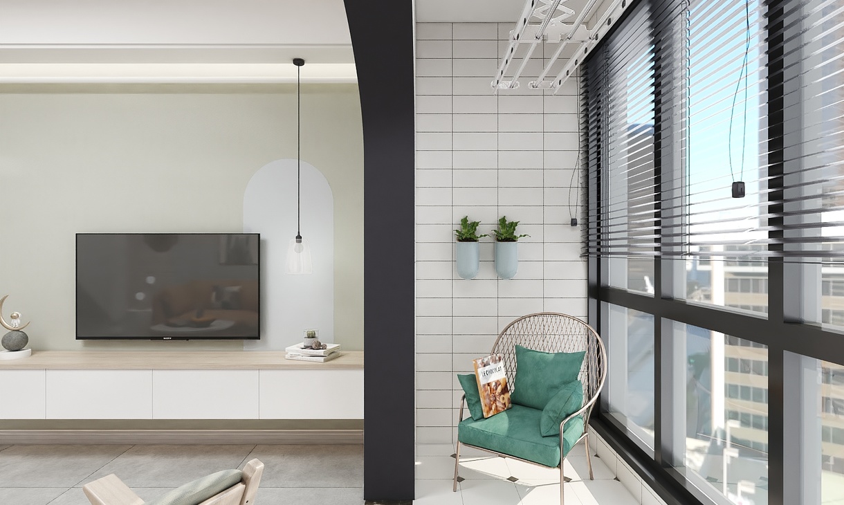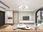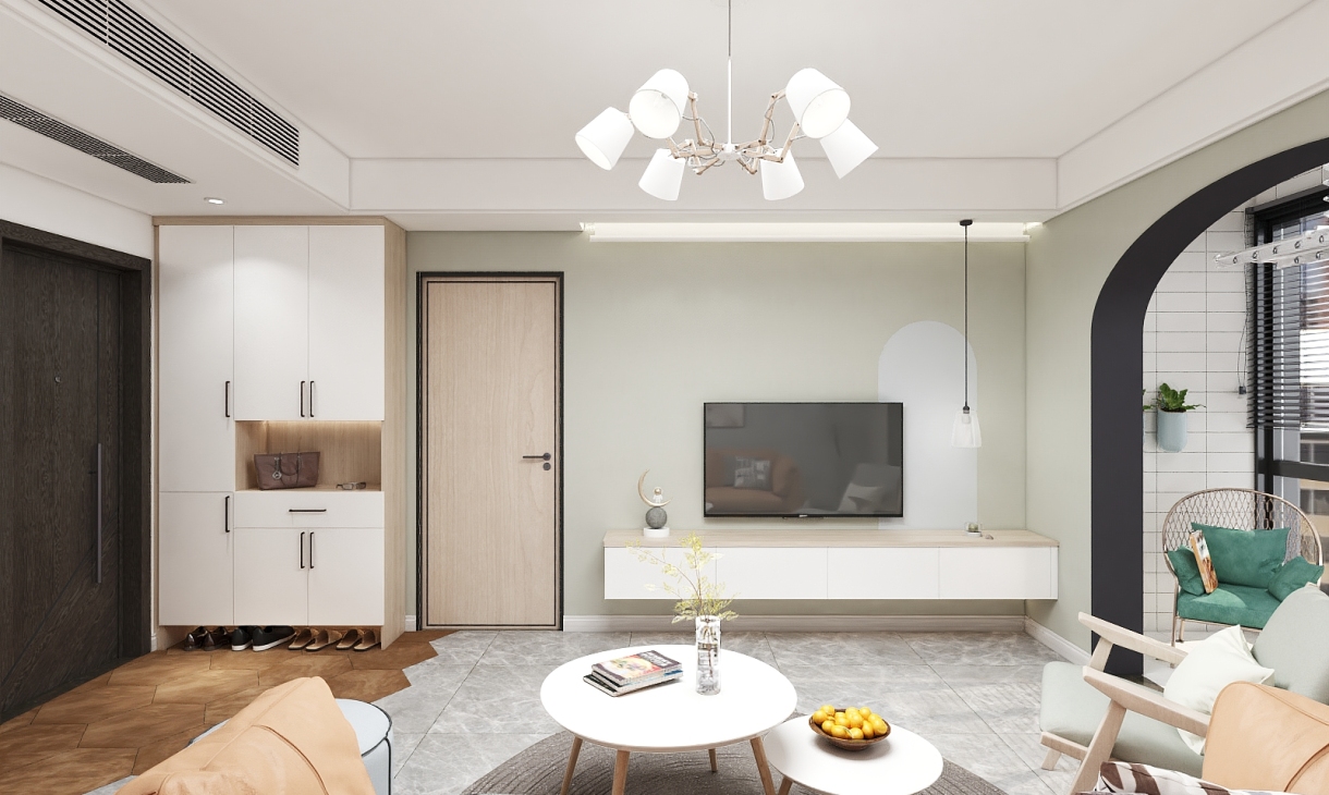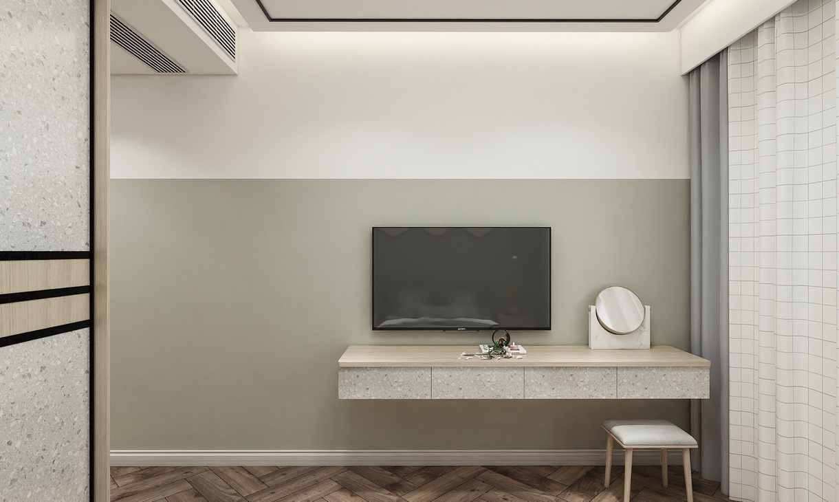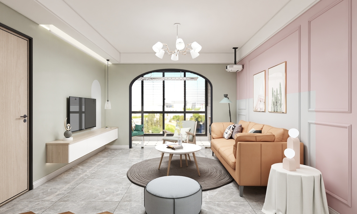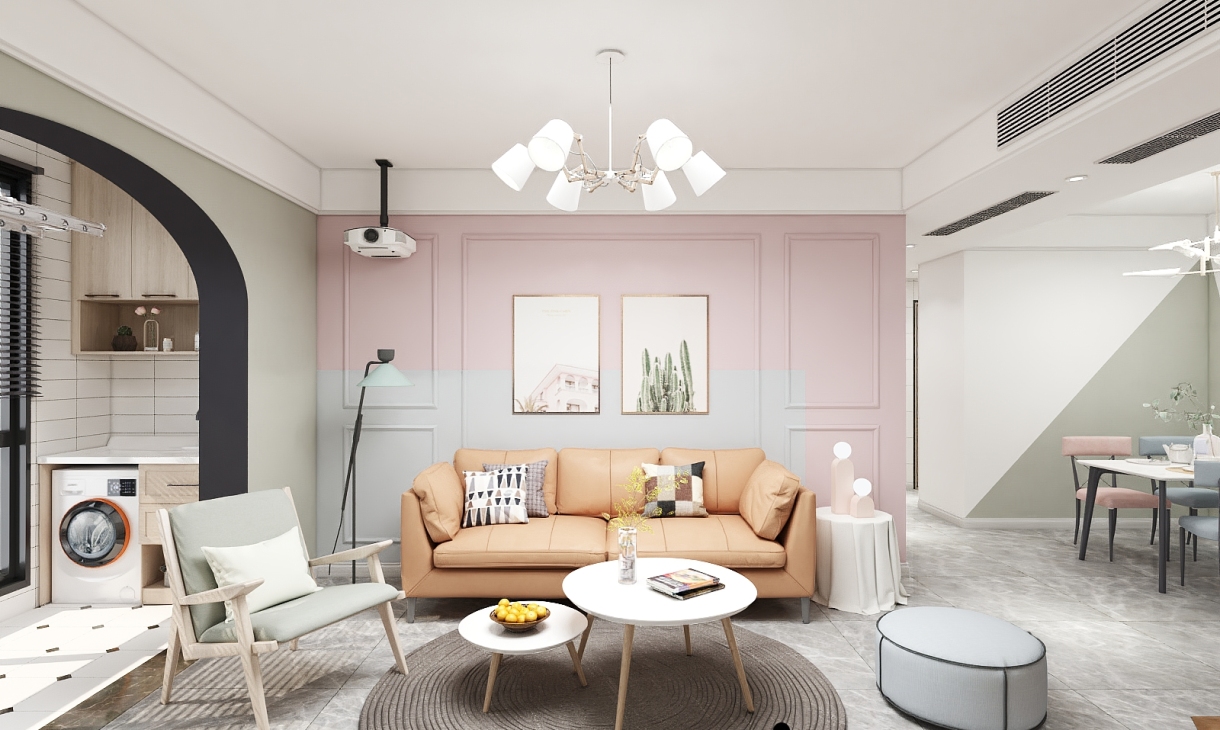 客厅设计干净清爽,沙发背景墙是灰粉色和灰蓝色的拼接,搭配灰色地面和浅绿色电视墙,整体看上去很是协调。