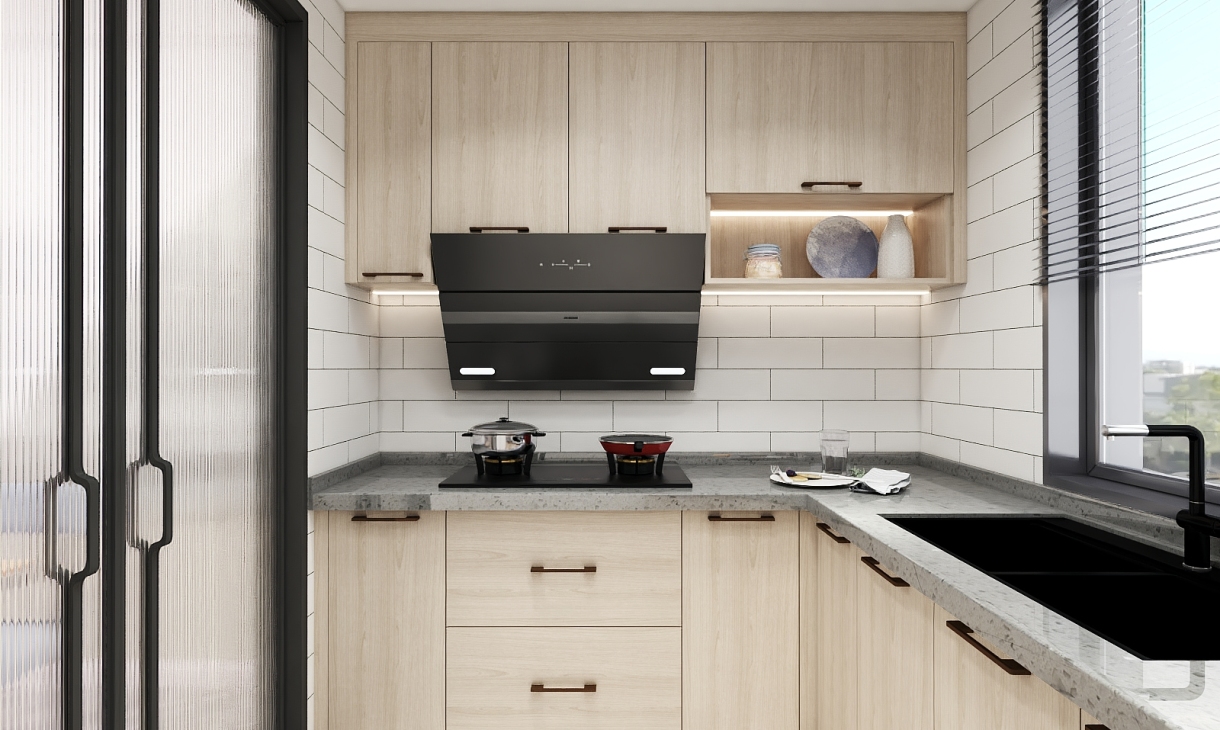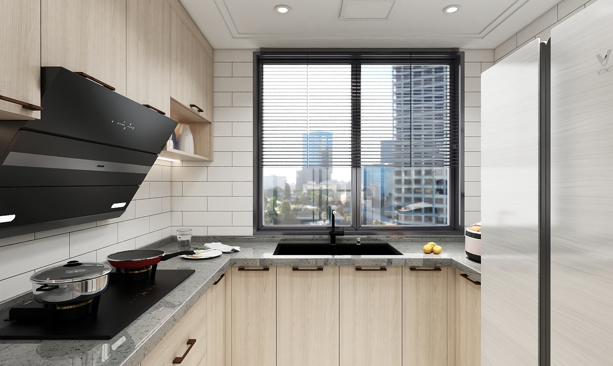从冰箱取物到洗切炒的动线布置的很合理,使用起来比较方便,也显得和谐而美观