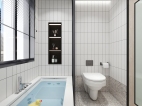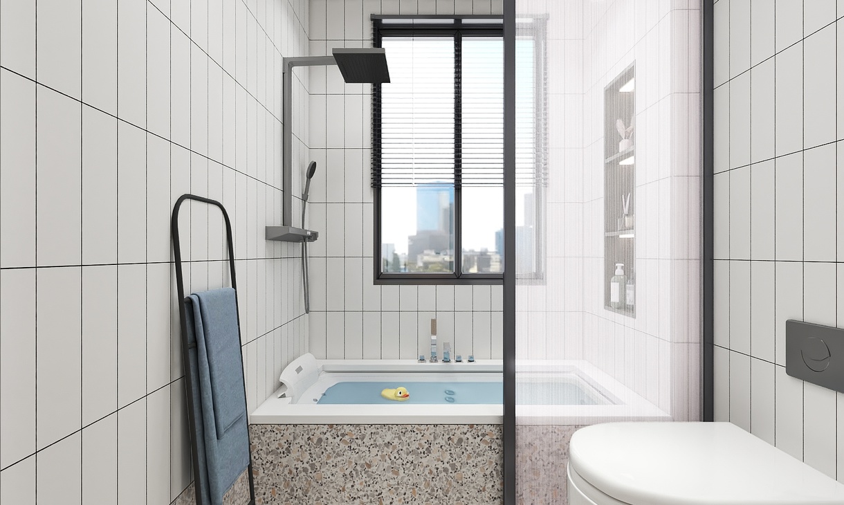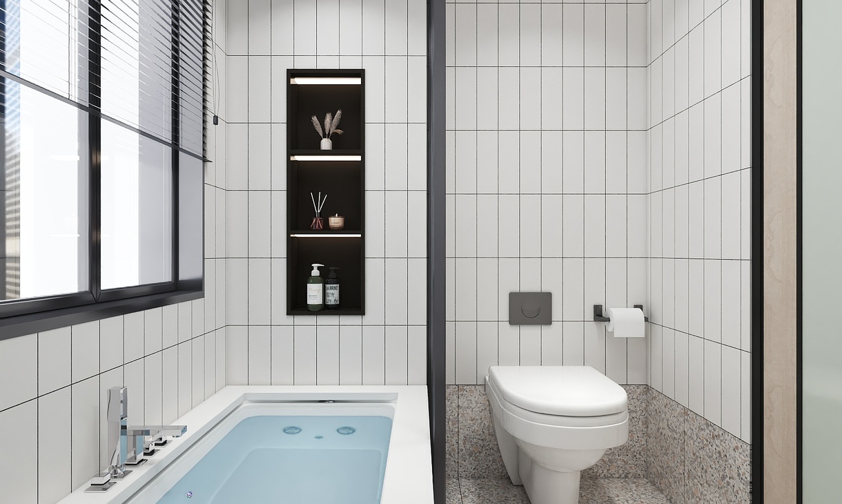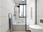 分离式卫生间,湿区,水磨石+白色长方形瓷砖竖铺,配以嵌入式浴缸。