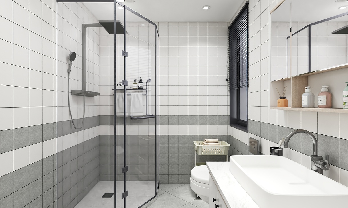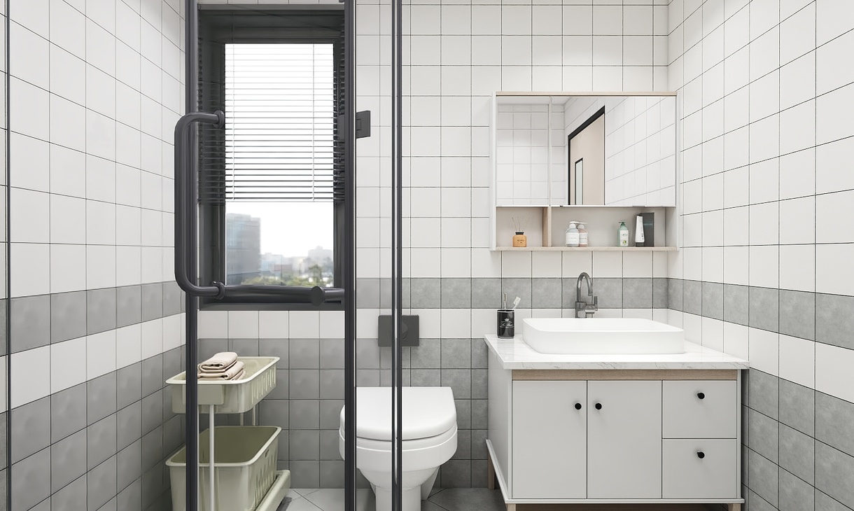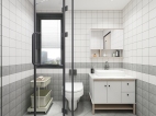 整体瓷砖是白色小方砖和深灰色方砖的组合,两者搭配,简洁大方。