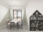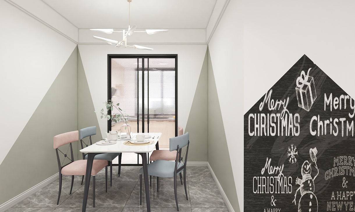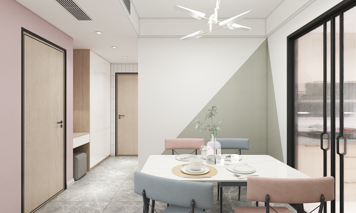 餐厅紧挨厨房,这样进出厨房很方便,餐厅局部应用三角造型浅绿配色,可以跟大面积的白色做自然的过渡。