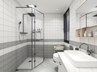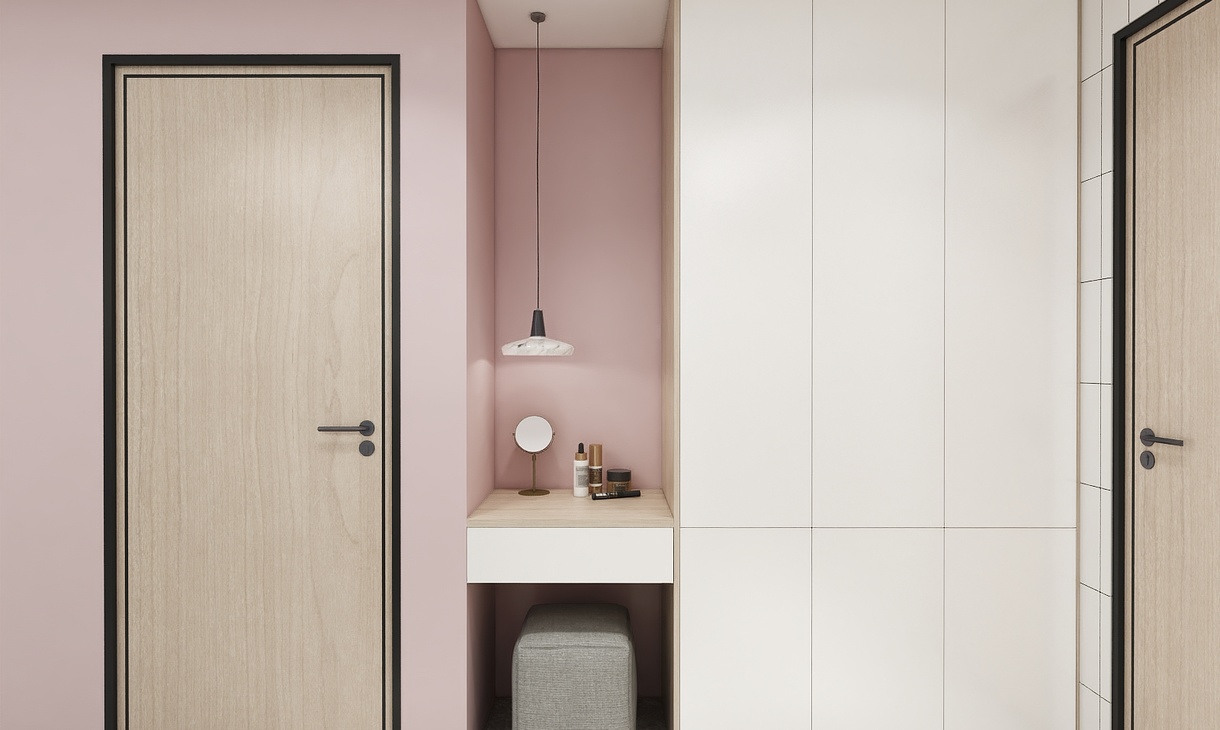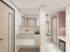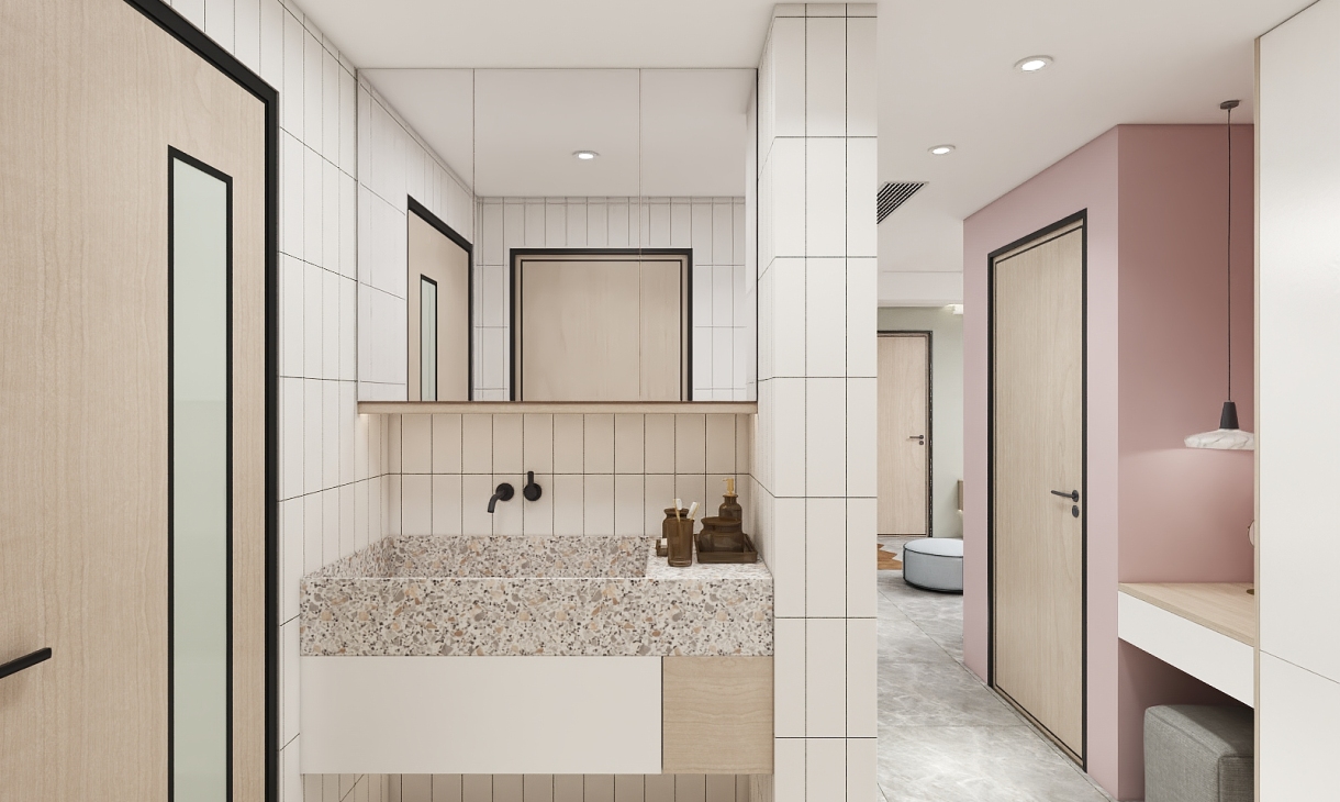 分离式卫生间,干区,同时在过道中嵌入一组储物柜和梳妆台,让生活更加方便。
