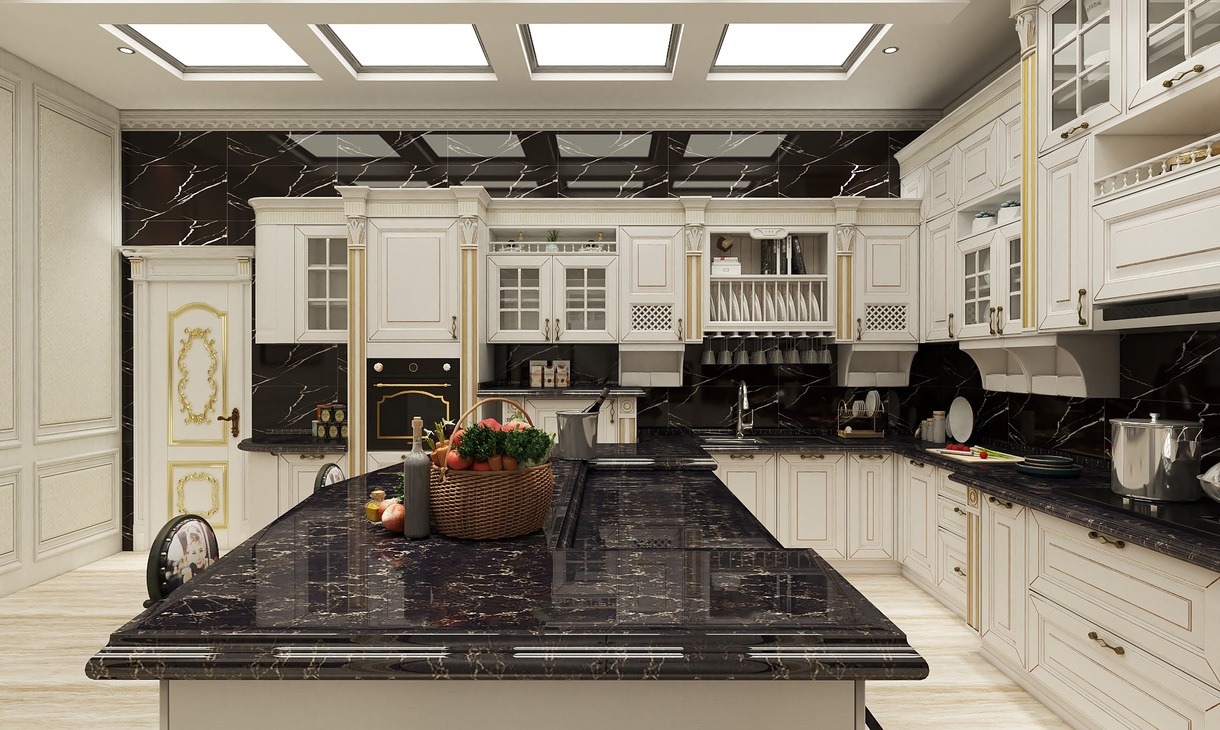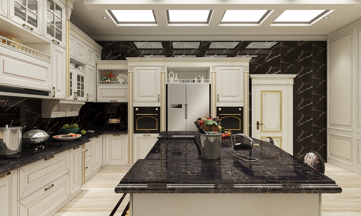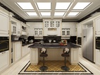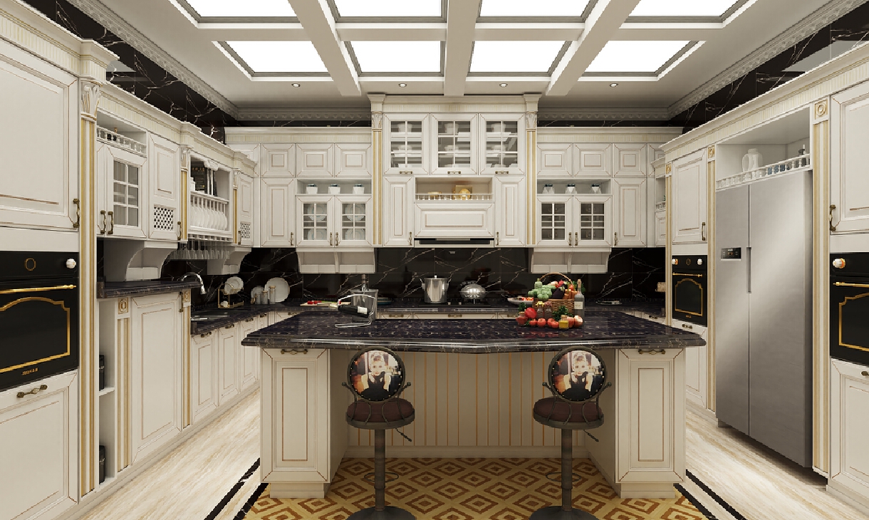 设计师以白色为主基调,金色线条点缀厨房空间,简洁中带着奢华与质感。将现代和古典文化的细节巧妙的融合为一个整体风格的开放式厨房,除了传统的中厨设计,还融入了西方文化理念,将怀古的浪漫情怀与现代人对生活的需求相结合,兼容华贵典雅与时尚现代,反映出后工业时代个性化的美学观点和文化品位。