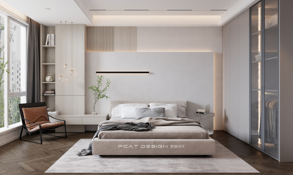简洁的背景墙板搭配原木色,让空间整体更加温馨,贯穿式床头柜,储物壁龛.....