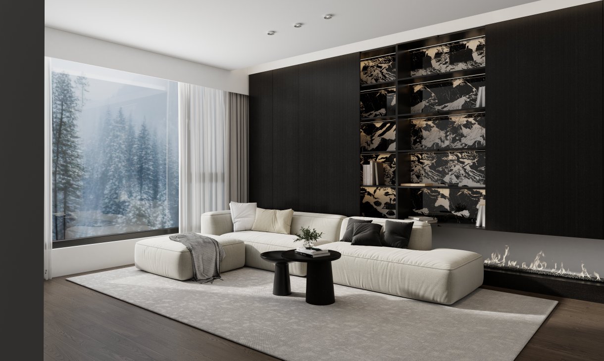 “墨韵”室内设计方案以简洁而高雅的黑白配色为基础,通过细腻的纹理和精巧的摆设,营造出宁静且富有韵味的空间。大面积的落地窗引入自然光线,与室内柔和的灯光相互映衬,增强了空间的通透感和温暖氛围。设计中运用了大量的自然元素,如木质地板和天然石材,赋予空间以自然之美。同时,独特的书架设计不仅增加了视觉层次感,还为生活增添了一份文化气息。整体设计旨在创造一个兼具舒适与艺术感的生活空间,让居住者在静谧优雅的环境中感受到古典与现代的和谐共存。