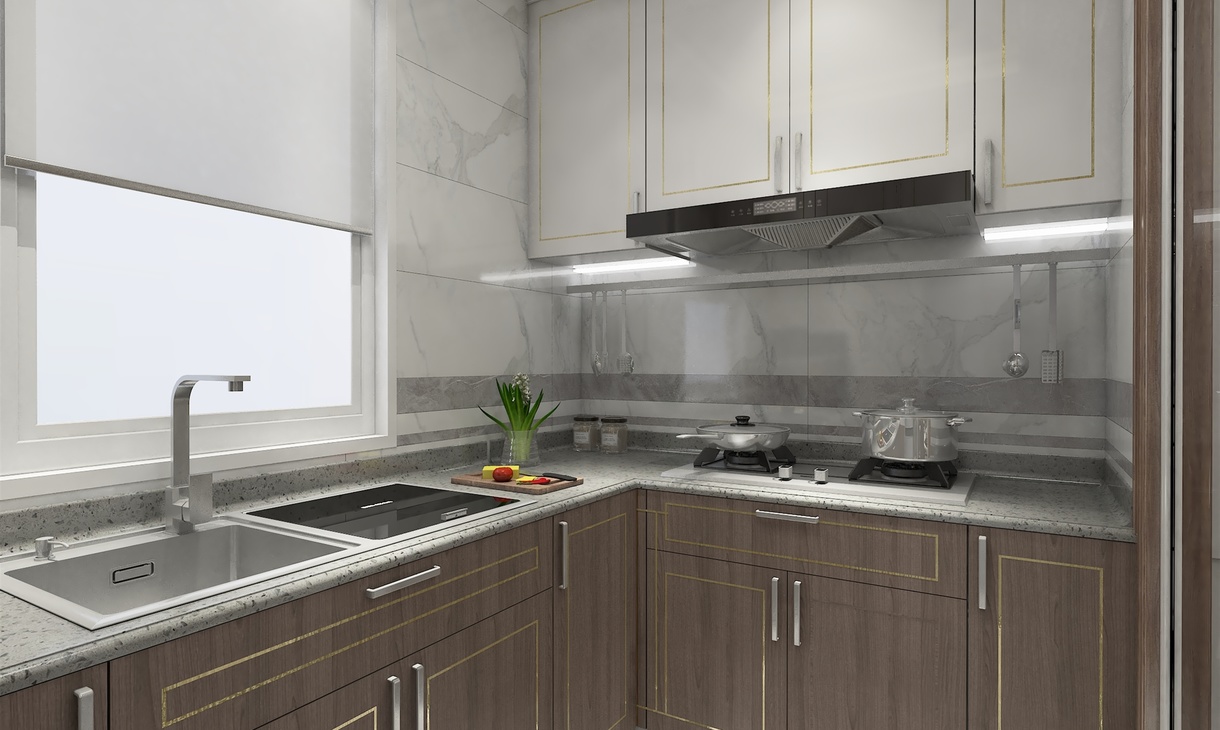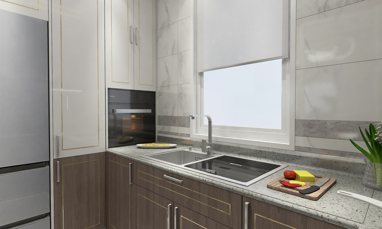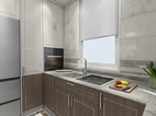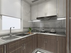 厨房空间是采用白色+木色来搭配装饰,墙、地面选用白色浅纹大理石瓷砖进行铺贴,橱柜则是浅木色,搭配白色斑点人造石台面很是美观、简洁。不过厨房中的电器都是采用的黑色调颜色,恰到好处的嵌入式设计在厨房内,整体上看一切从简设计,以简约功能化为主,注重空间结构布局,强调厨房的明亮与简洁。这种设计充分体现了现代生活的简约、实用