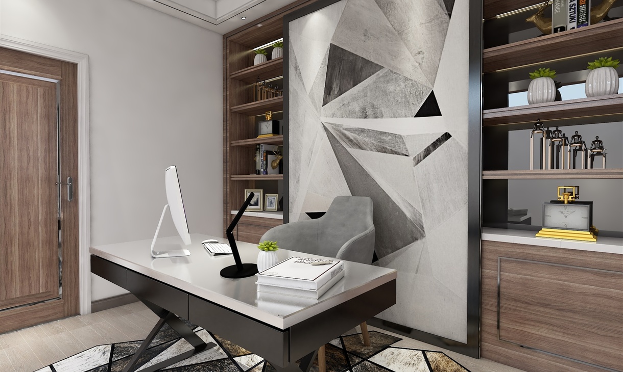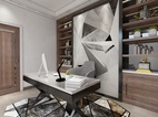 精心设计的书柜,通过唯美的几何图案立面点缀,来表现时尚性和当代性,还采用了深灰的皮质单椅再加几何异形的地毯来丰富整个空间。